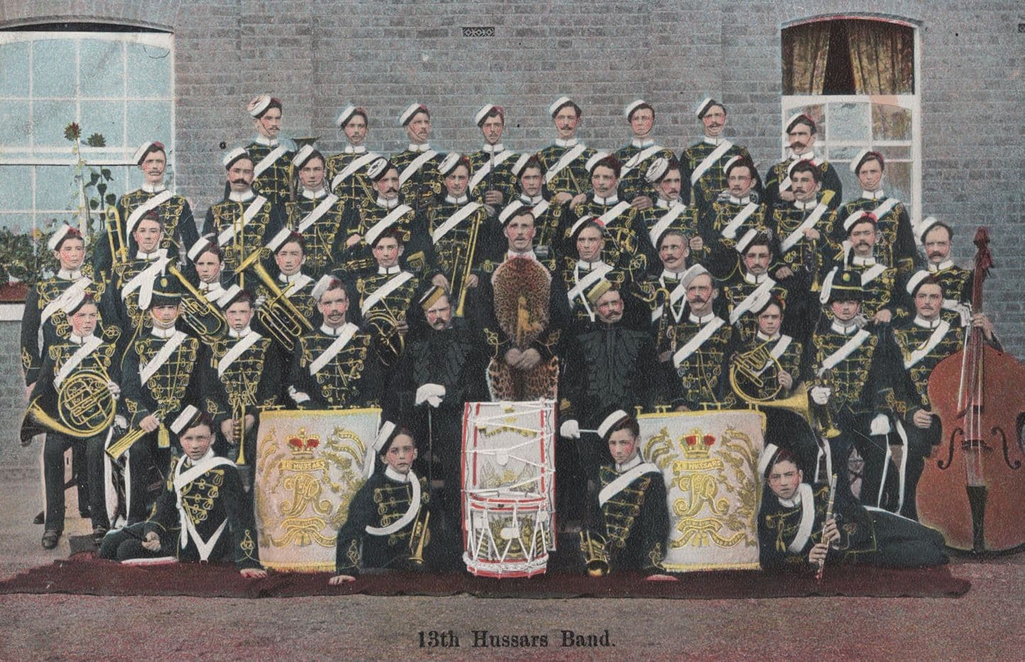 zx699 Antique early 1900s postcard of the 18th Hussars Band - has corner impressions from former album storage but  very good and allowing mostly otherwise great condition. (vg/vg+ unused)