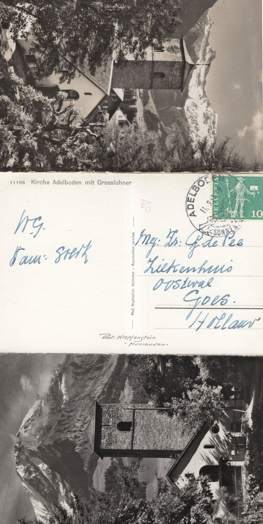 zx125 Three vintage real photo postcards of the church at Adelboden - please note one of the postcards is a duplicate but has an interesting frank on reverse so I have scanned and included this for you too - bar just one smallish place all are great condition and real photographic from the same publisher,.