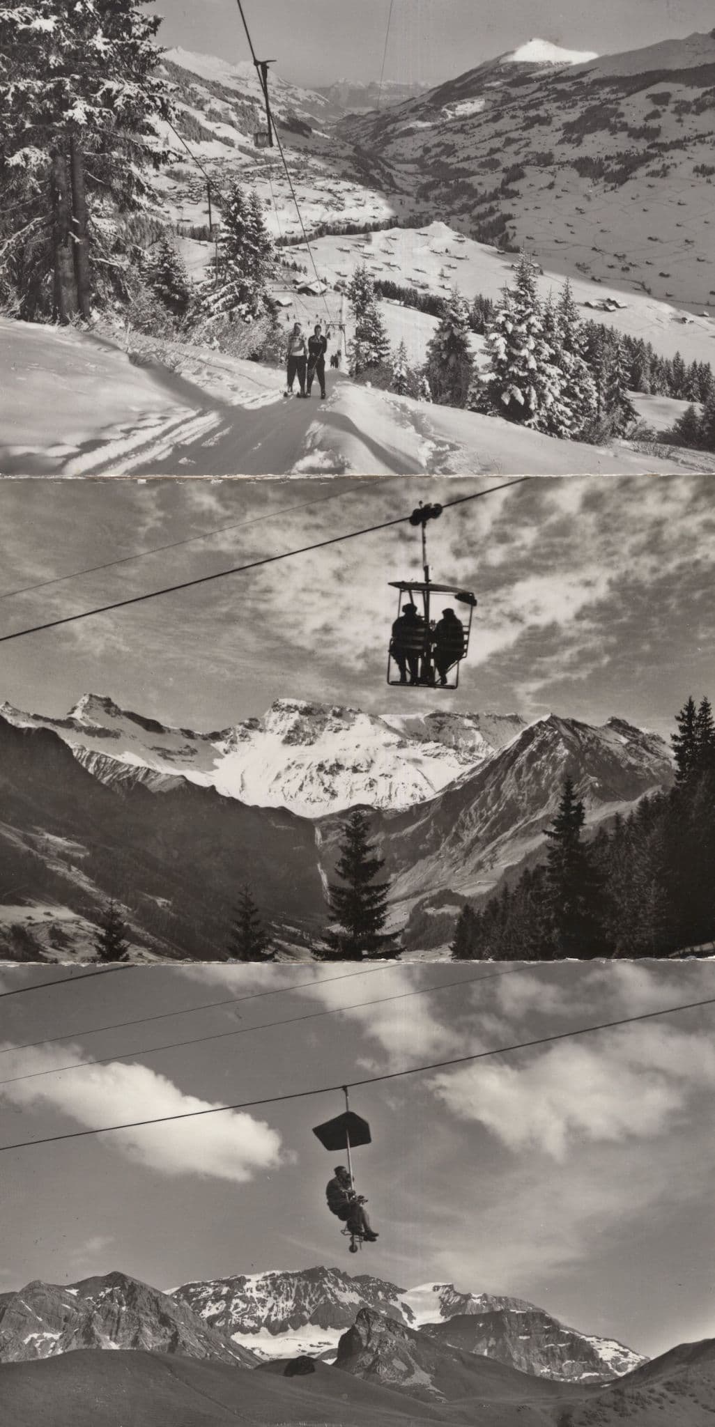 zx167 Three vintage real photo postcards and the best Adelboden "mountain lift" postcards from a huge collection as these all show the fear of first approaching the lift as it goes over your head with other passengers, then two further views of people dangling on its open edges - all are used but great condition and real photographic too