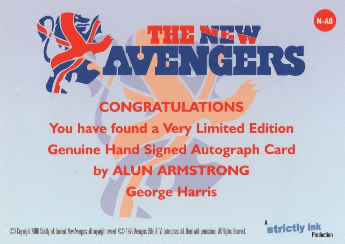 TC7 Surely the best opportunity of its kind to secure this very rare autograph signing of Alun Armstrong as George Harris in The New Avengers who has personally signed the card where his signature is placed perfectly besides his portrait. This is an official limited edition souvenir of which the publishers have fully validated the hand signing by the actor on the reverse so you cannot get better guarantee of lifetime authentification (see image 2) It reads "Congratulations. You have found a limited edition genuine hand signed autograph card of Alun Armstrong" .It is in absolute mint condition.
