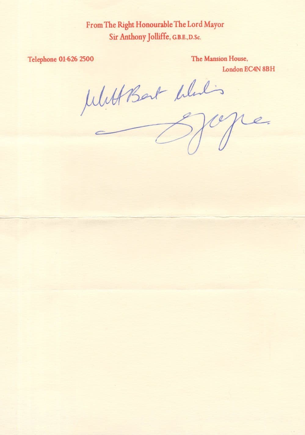CHAU3171 A vintage headed paper letter of Sir Anthony Joliffe personally autographed by the historic 1980s London Mayor (& later Deputy Lieutenant of Dorset) which is folded where posted otherwise outstanding condition and undedicated signing too.