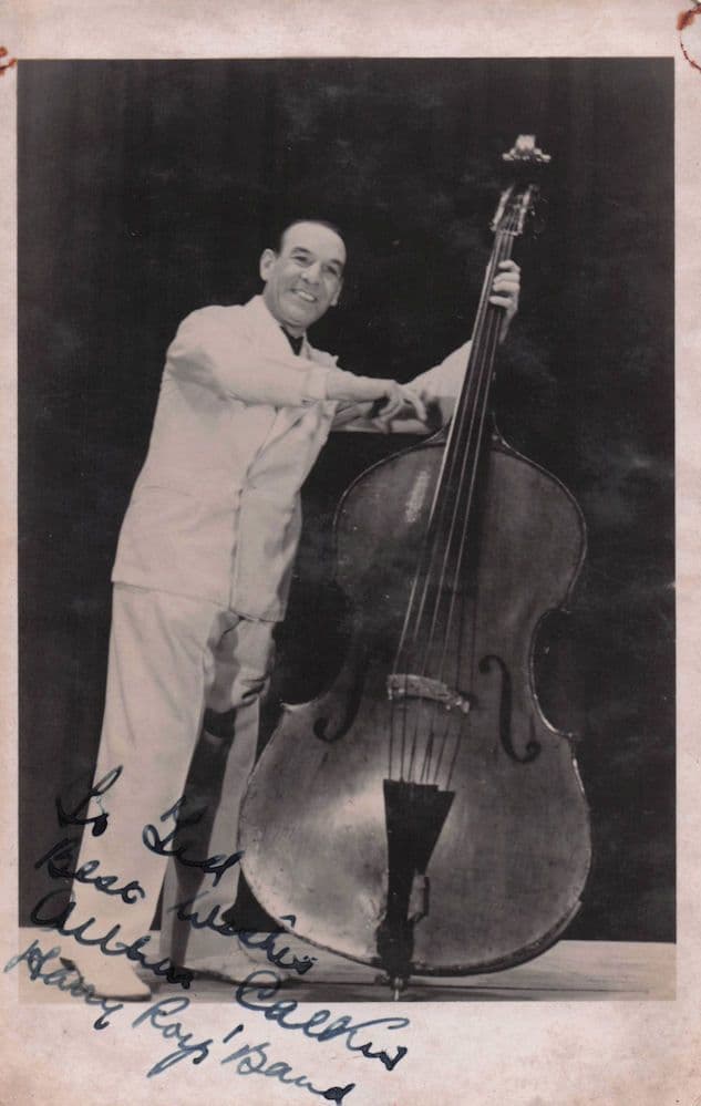 PFAS190 This is a superb opportunity to secure this 6" x 4" antique real photo postcard of stringed bass player Arthur Calkin of The Harry Roy Band and Orchestra with the postcard being a very rare souvenir showing Arthur in front of his double bass which is even bigger than him !! Whilst undated this would seem 1940s or earlier- Arthur Calkin has personally hand signed the souvenir where the signature rests perfectly accompanying his portrait - please note whilst unused has a used appearance (small corner places just on reverse from former album strorage) - has surface to allow - small places - some aged areas - graded good plus perhaps bordering vg minus unused but this is such a scarce souvenir as surely the only one of its kind being an original postcard of Arthur Calkin and hand signed by the musician too.