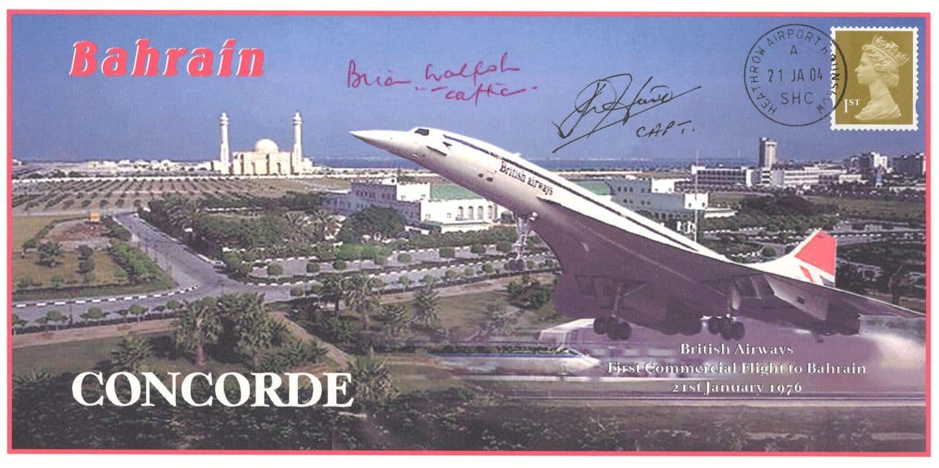STB024 This is a stunning Concorde Bahrain Last Flight 2004 collectors official limited edition first day cover hand which was a limited edition of just two and reverse states "Certified 1 of 2" signed by historic Concorde veterans Brian Walpole and John Hurst where both signatures rests perfectly accompanying the special hand commemorative franks with full hallmarking of the series which only one was signed by both Brian Walpole and John Hurst (fully certified on reverse) in absolute brand new mint condition. You wont source better.