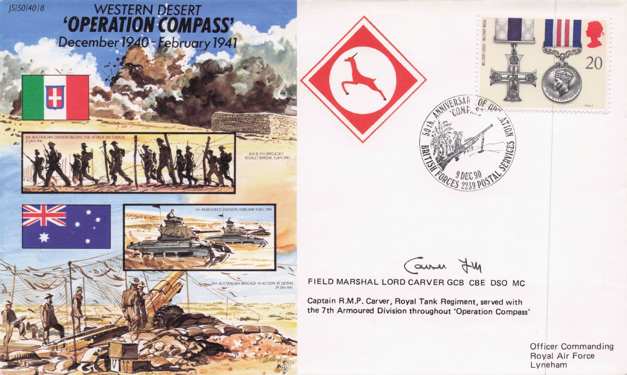 STB040 This is stunning Operation Compass collectors official limited edition first day cover hand signed by veteran Captain RMP Carver (also Baron and Lord GCB CBE DSO MC) where his signature rests perfectly accompanying the special hand commemorative franks. This comes with full lifetime COA as the signing has been officially witnessed and certified by the publishers with full hallmarking and a second signing on reverse for lifetime authenticity.. This reads "and more" for you are also getting a plain back real photo postcard from the publishers of Lord Carver making this the ultimate opportunity of its kind and all contents are in outstanding condition.