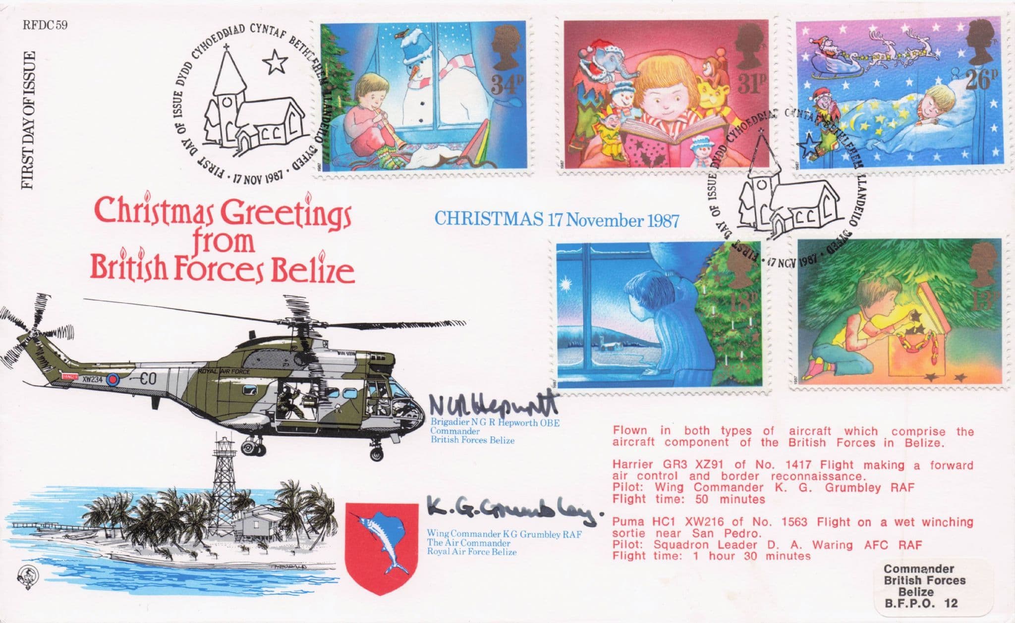 STB037  A stunning 1987 origin Christmas Forces From Belize first day cover hand signed by both Wing Commander KG Grumbley and Brigadier NGR Hepworth OBE where both veterans signatures rests perfectly accompanying the commemorative franks with further witnessed signature on reverse for lifetime COA in truly outstanding condition.