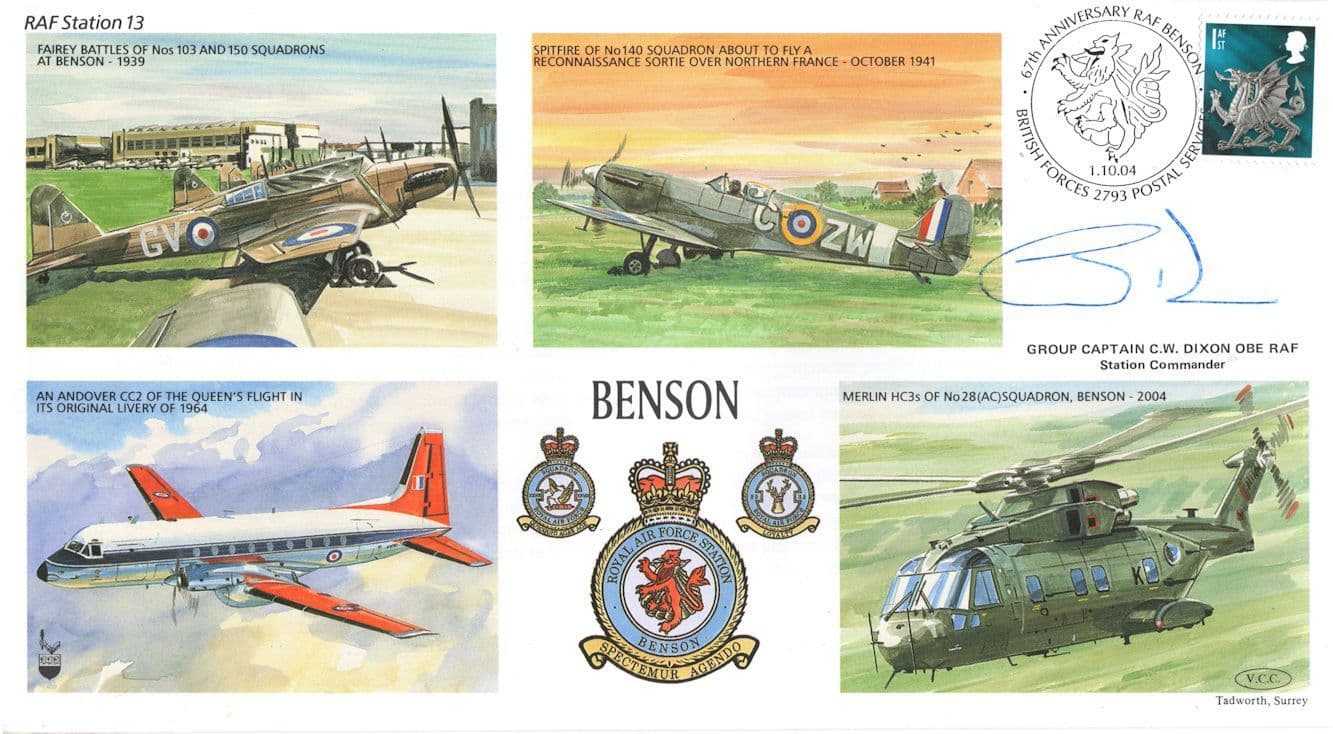 STB021 This is stunning RAF Benson collectors official limited first day cover hand signed by CW Dixon Group Captain OBE where the signature rests perfectly accompanying the special hand commemorative franks. This comes with full lifetime COA as the signing has been officially certified by the publishers with full hallmarking and authenticity of the series further detailed in absolute brand new mint condition with additional signature on reverse to fully authenticate and a large map of Benson which this edition is LIMITED TO ONLY 80 and numbered 11 from the series (see image 2). You wont source better.