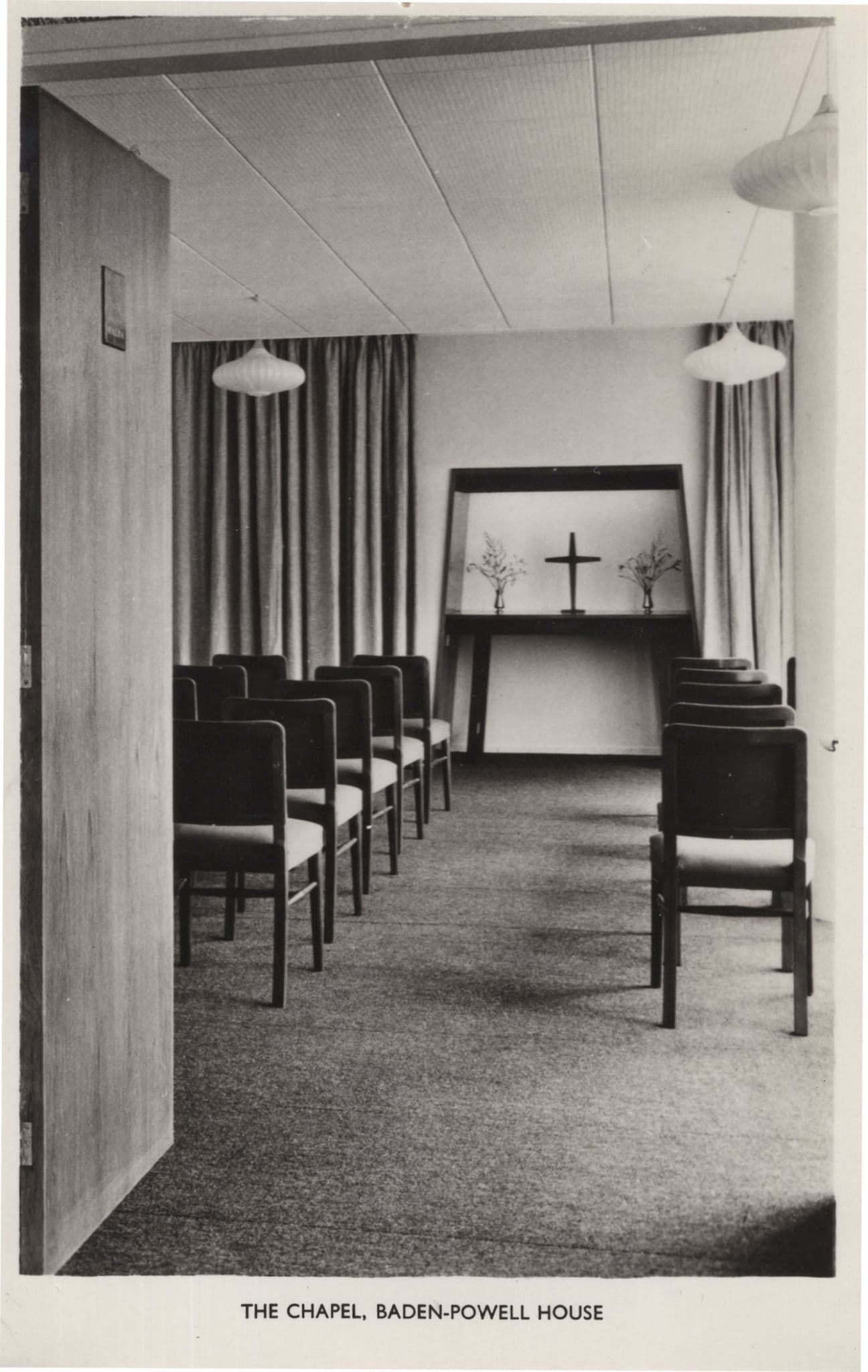 zx507 A vintage 1950s real photo postcard of the Boy Scouts Chapel inside Baden Powell House in London from nearly 70 years ago unused and virtually mint condition - truly outstanding and you wont source better - Shows the chairs laid and holy Cruxifix laid for worship on the altar for the scouts -  Please see all my other old real photo Scouts and Guides postcard from this same former collector all listed at my store.