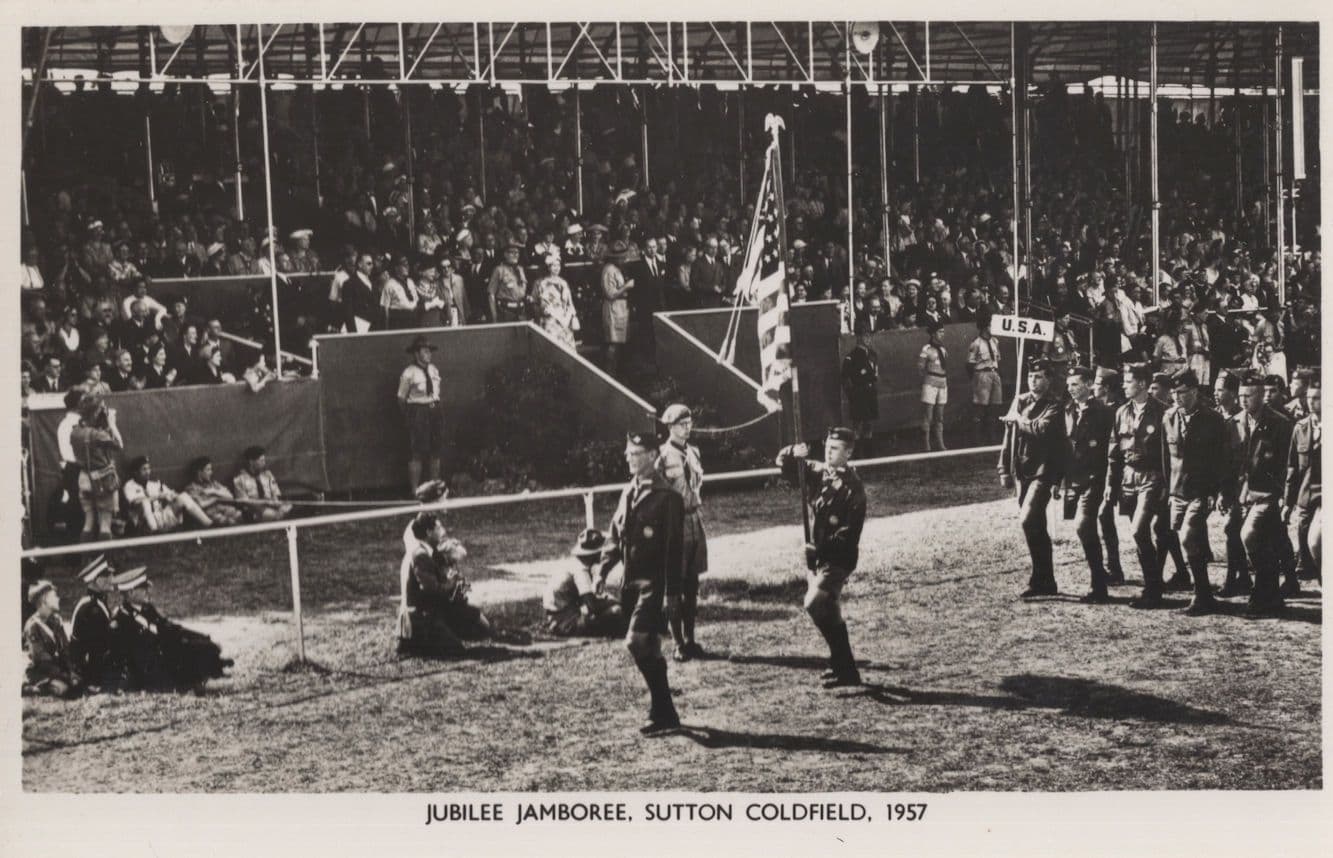zx507 A vintage 1957 real photo postcard of the Boy Scouts procession at the Jubilee Jamboree of the same year held at Sutton Coldfield unused and mint - same as brand new and you wont source better - Please see all my other old real photo Scouts and Guides postcard from this same former collector all listed at my store.