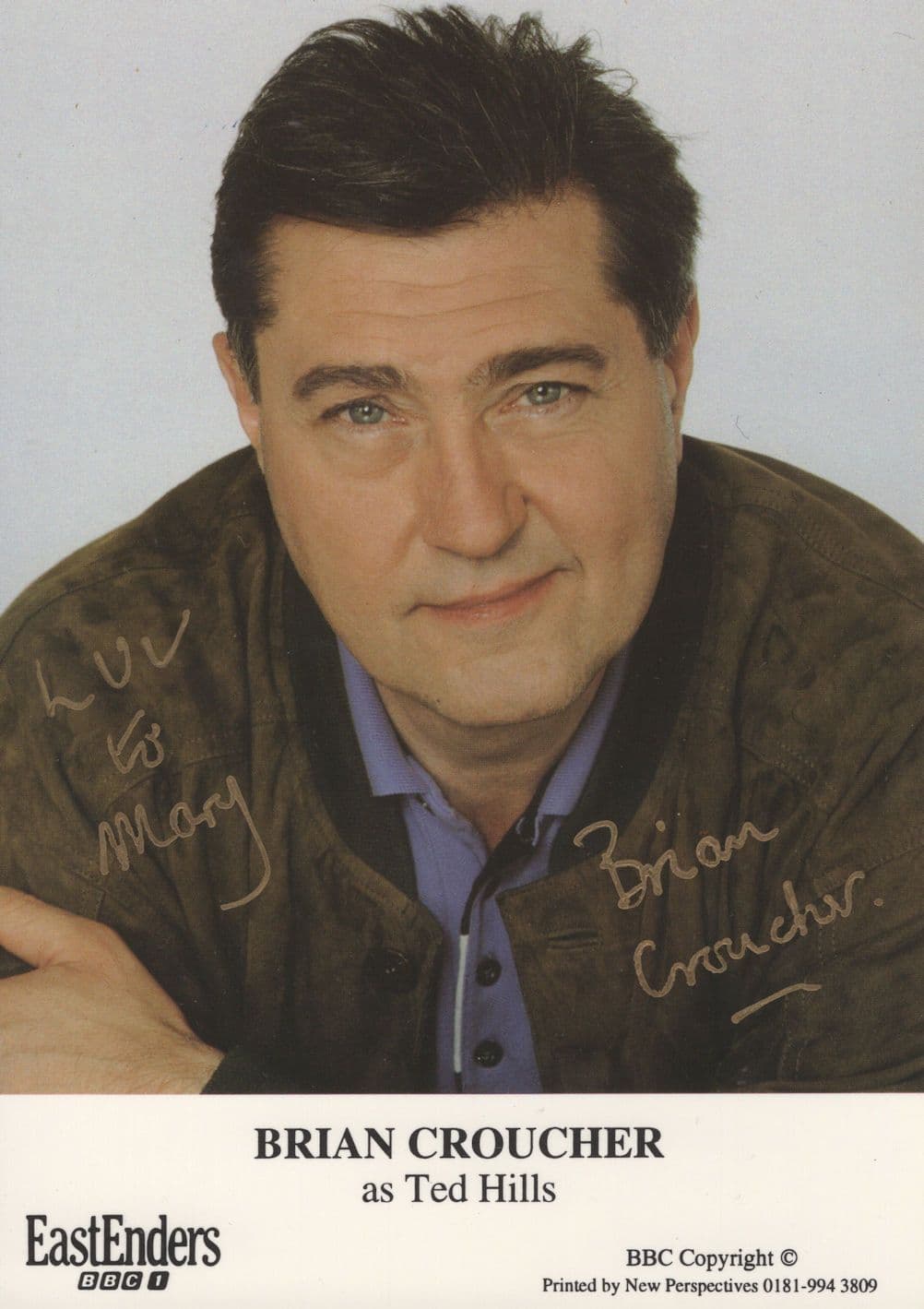 PFAS1  This is a superb opportunity to secure this official 6" x 4" hand signed cast card of Brian Croucher in BBC Eastenders who has hand signed the photo where his signature rests perfectly in netallic gold ink accompanying the portrait in mint condition.