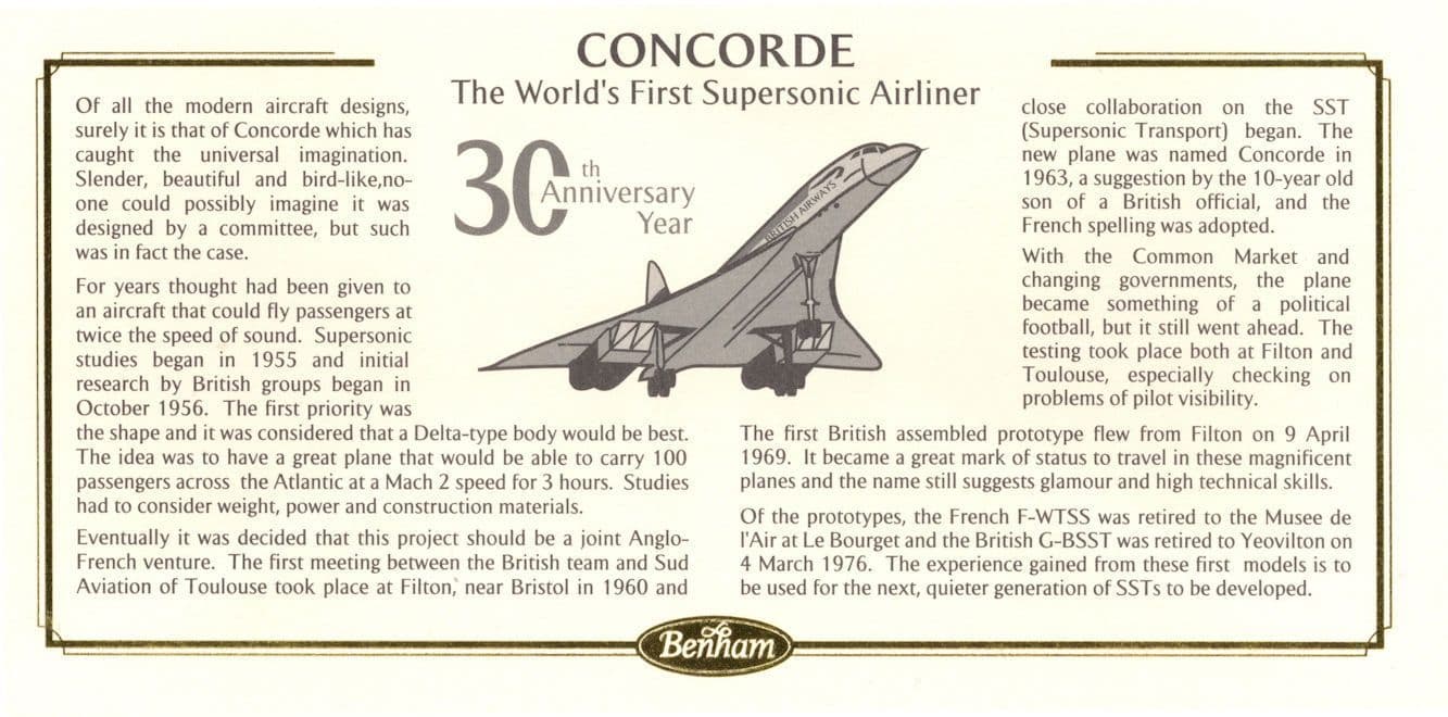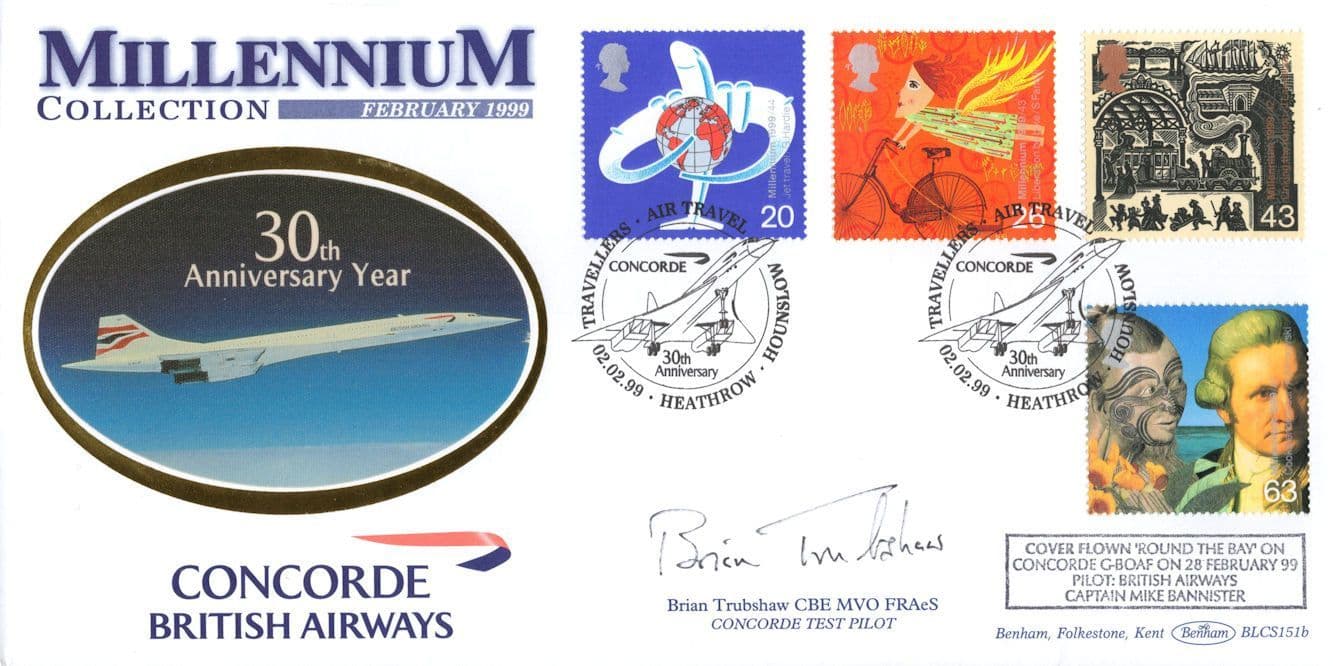 STB012x This is stunning collectors official limited 1999 Millennium Collection Benham first day cover hand signed by historic Concorde pilot Brian Trubshaw where the signature rests perfectly accompanying the special hand commemorative franks. This comes with full lifetime COA as the signing has been officially certified by the publishers with full hallmarking and authenticity of the series further detailed on reverse in absolute brand new mint condition and with all the accompanying inserts too. You wont source better.