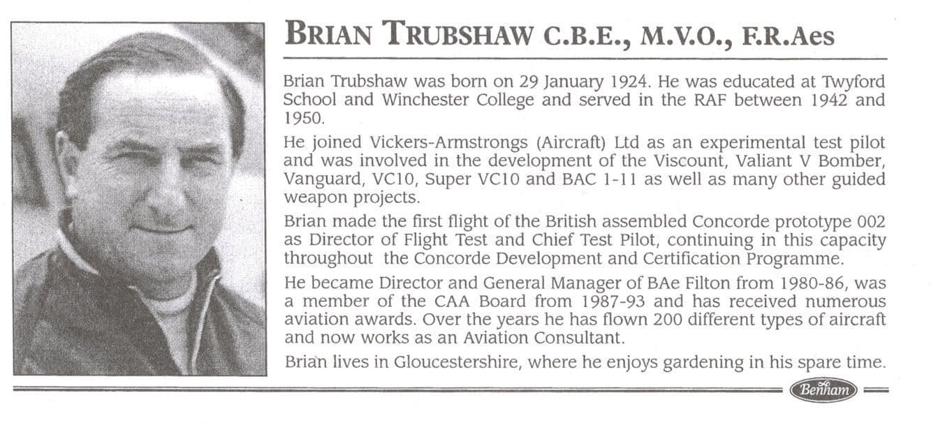 Ernest Brian Trubshaw, CBE, MVO was a leading test pilot, and the first British pilot to fly Concorde, in April 1969 on a flight from Filton to its test base at RAF Fairford. He emerged from Concorde 002's futuristic cockpit with the words: "It was wizard – a cool, calm and collected operation." Weeks earlier he had piloted an early test flight of the identical French prototype Concorde 001, commanded by André Turcat. Trubshaw and Turcat were both awarded the Iven C. Kincheloe Award in 1971, for their work on Concorde.He was appointed a Member of the Royal Victorian Order in 1948. He was awarded the OBE in 1964 and the CBE in 1970 and was awarded the French Aeronautical Medal in 1976.