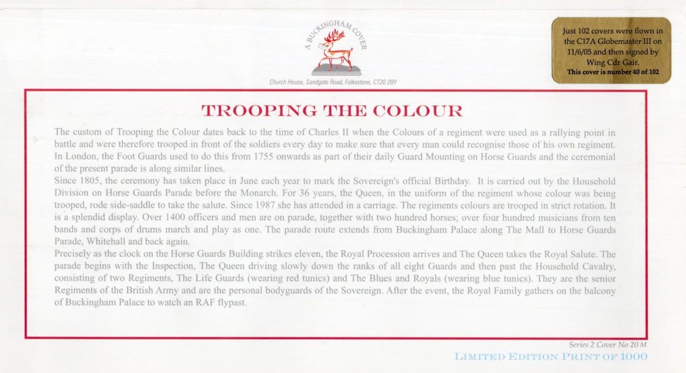 STB034 This is stunning Buckingham collectors official limited Trooping The Colour first day cover hand signed by Wing Commander Cameron Gair (Captain of C17A Globemaster III and who lead the sky procession over the Trooping The Colour ceremony on the Queen's birthday) where the signature rests perfectly accompanying the special hand commemorative franks. This comes with full lifetime COA as the signing has been officially certified by the publishers with full hallmarking and authenticity of the series further detailed in absolute brand new mint condition. You wont source better. (autographed by Cameron Gair of this cover were limited to only 105 for world distribution - please see image 2)