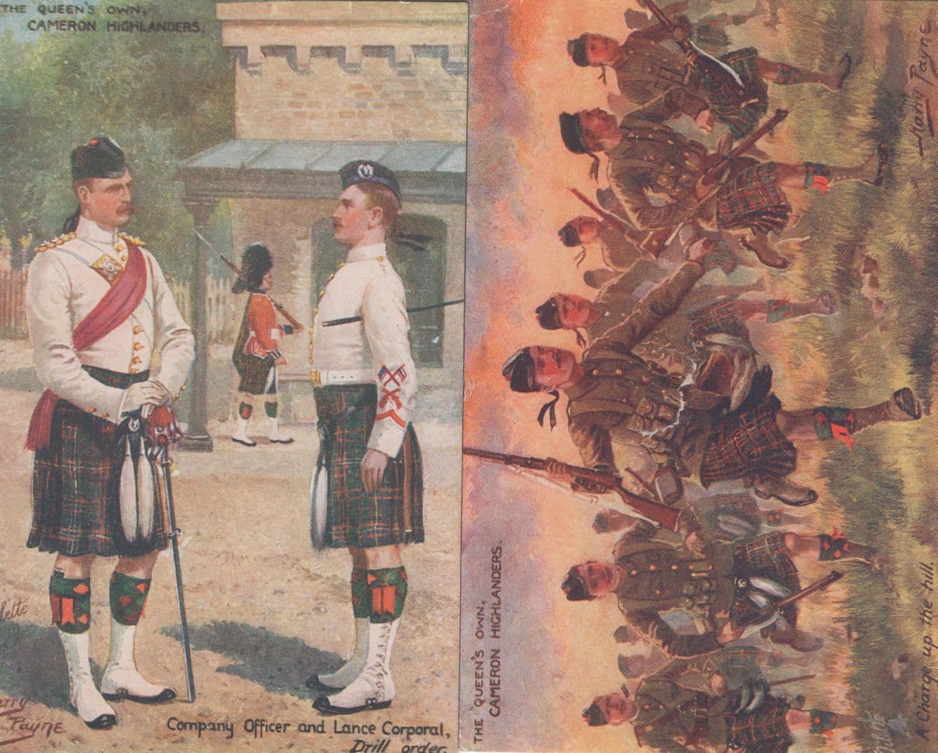 zx298  Antique postcard of the Officer & Lancing Corporal of the Cameron Highlanders unused and mint - Comes with bonus free postcard of the Tucks Harry Payne Highlanders postcard of them charging - this has a small tear and as such is a completely free addition but I will send with compliments to the buyer of the Corporal & Company Officer Oilette to make this a great themed listing (this card is pristine but buyer must allow for the fault with the other).