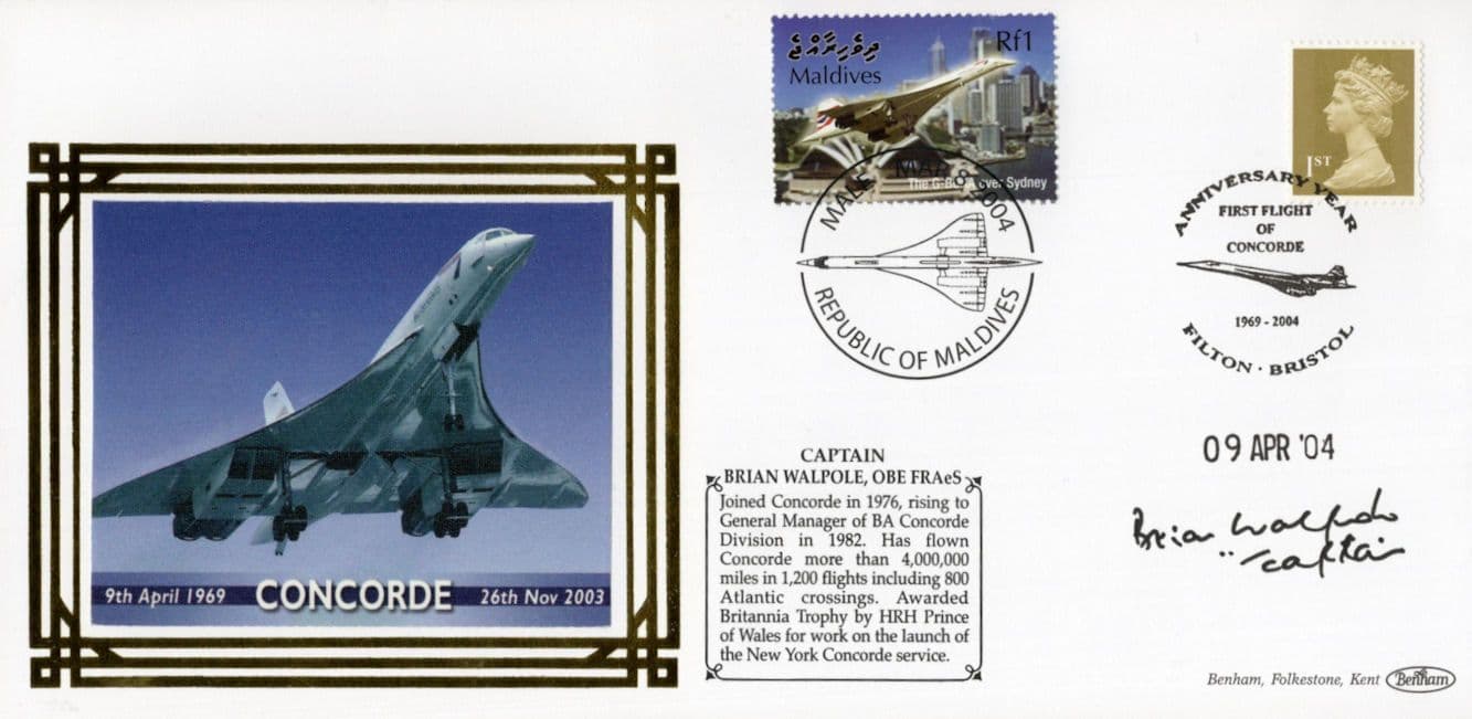 STB034 This is stunning1969 to 2003 Concorde collectors official limited edition first day cover hand signed by historic Concorde pilot Captain Brian Walpole where the signature rests perfectly accompanying the special hand commemorative franks.  This comes with full lifetime COA as the signing has been officially certified by the publishers with full hallmarking and authenticity of the series further detailed in absolute brand new mint condition. You wont source better.