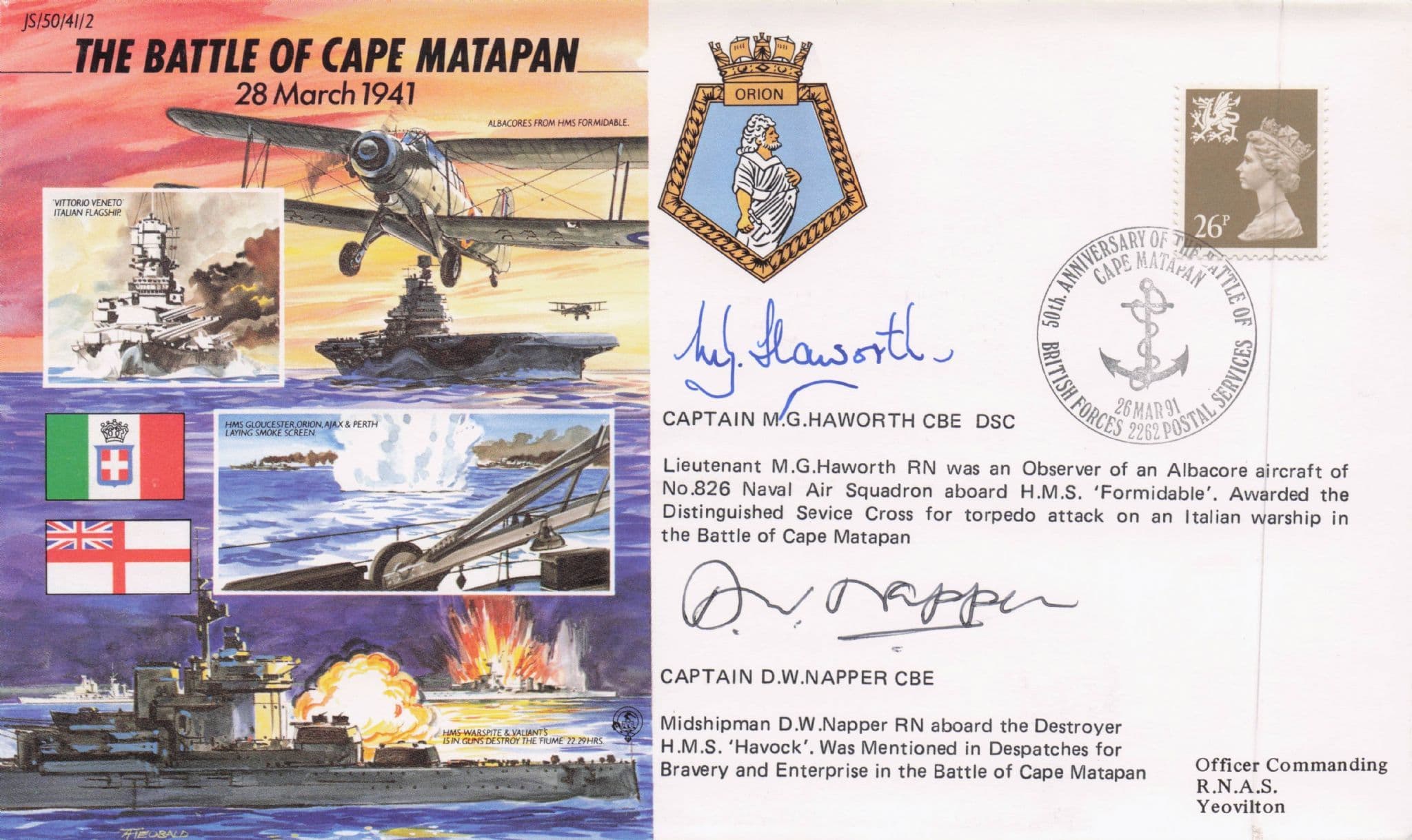 STB040 This is stunning Battle Of Cape Matapan collectors official limited edition first day cover hand signed by both Captain DW Napper CBE (who was awarded Dispatches For Bravery & Enterprise from the Battle Of Matapan) and Captain MG Haworth where both of the signatures rests perfectly accompanying the special hand commemorative franks. This comes with full lifetime COA as the signing has been officially witnessed and certified by the publishers with full hallmarking and a third signing on reverse for lifetime authenticity.. This reads "and more" for you are also getting a plain back real photo postcard from the publishers showing both these historic veterans making this the ultimate opportunity of its kind and all contents are in outstanding condition.