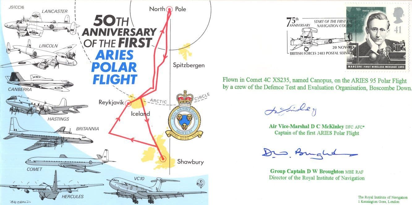 STB026  A stunning souvenir of the 50th Anniversary of First Aries Polar Flight signed by the Captain of that historic flight (see scan) and further hand signing too in mint condition.