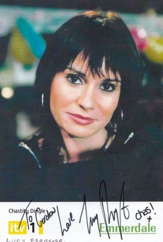 cel033 Original 6" x 4" photo of Emmerdale Farm's Chastity Dingle who has hand signed the cast card where the signature rests perfectly accompanying the image in mint condition