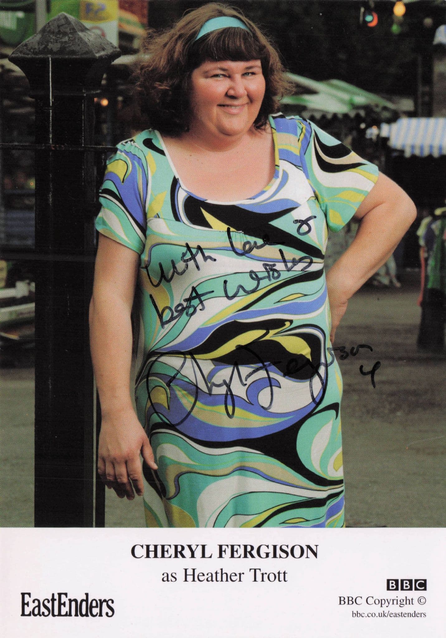 PFAS204  This is an original and official BBC cast card for Cheryl Ferguson As Heather Trott in Eastenders who has personally hand signed the souvenir where her signature rests perfectly accompanying her portrait. Finding her cast autograph undedicated is today scarce as she usually dedicates it for the recipients so surely the best opportunity for this official signed card and it is mint condition too.