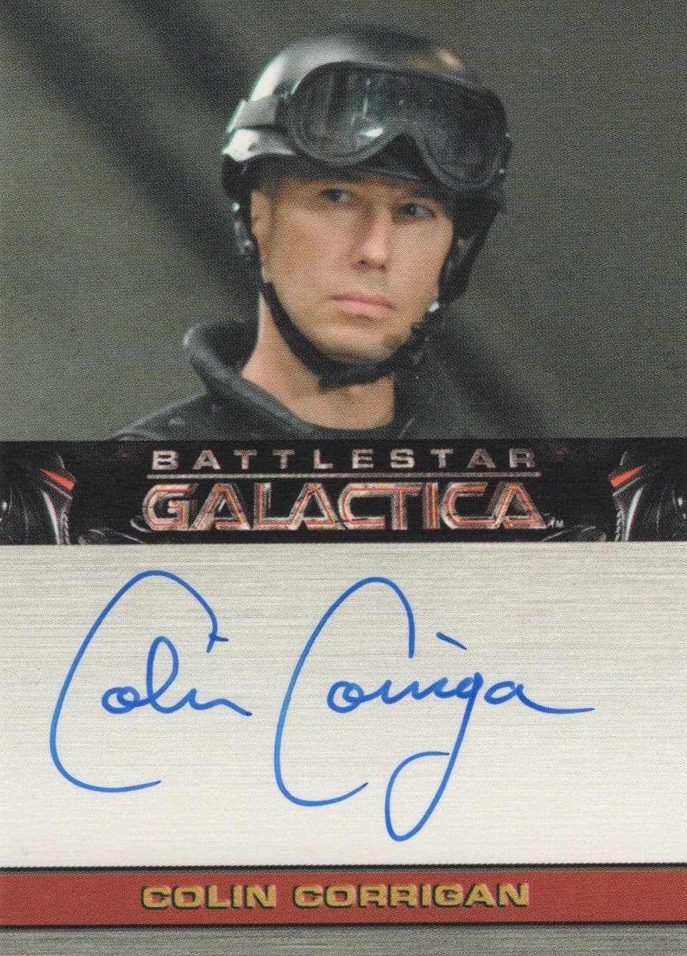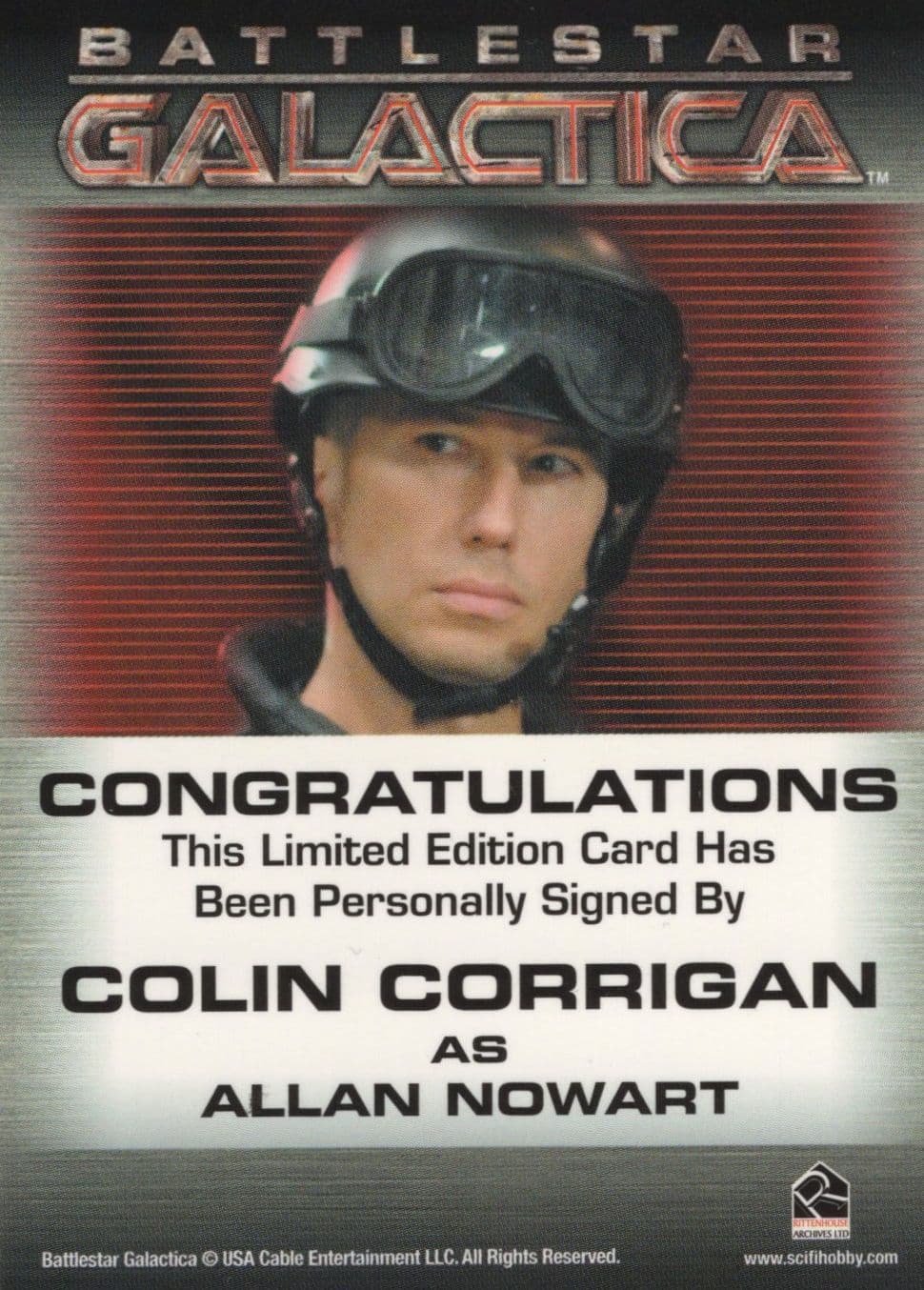 TC3 Surely the best opportunity of its kind to secure this very rare personal signing of Colin Corrigan and his character of Allan Nowart in the cult sci-fi show Battlestar Galactica where his signature is placed perfectly below his portrait. This is the official TV show souvenir and the signing has been fully validated on the reverse for the ultimate in lifetime authentification. It reads on the other side "Congratulations... This limited edition card has been personally signed by Colin Corrigan as Allan Nowart" ... . It is in absolute mint condition.