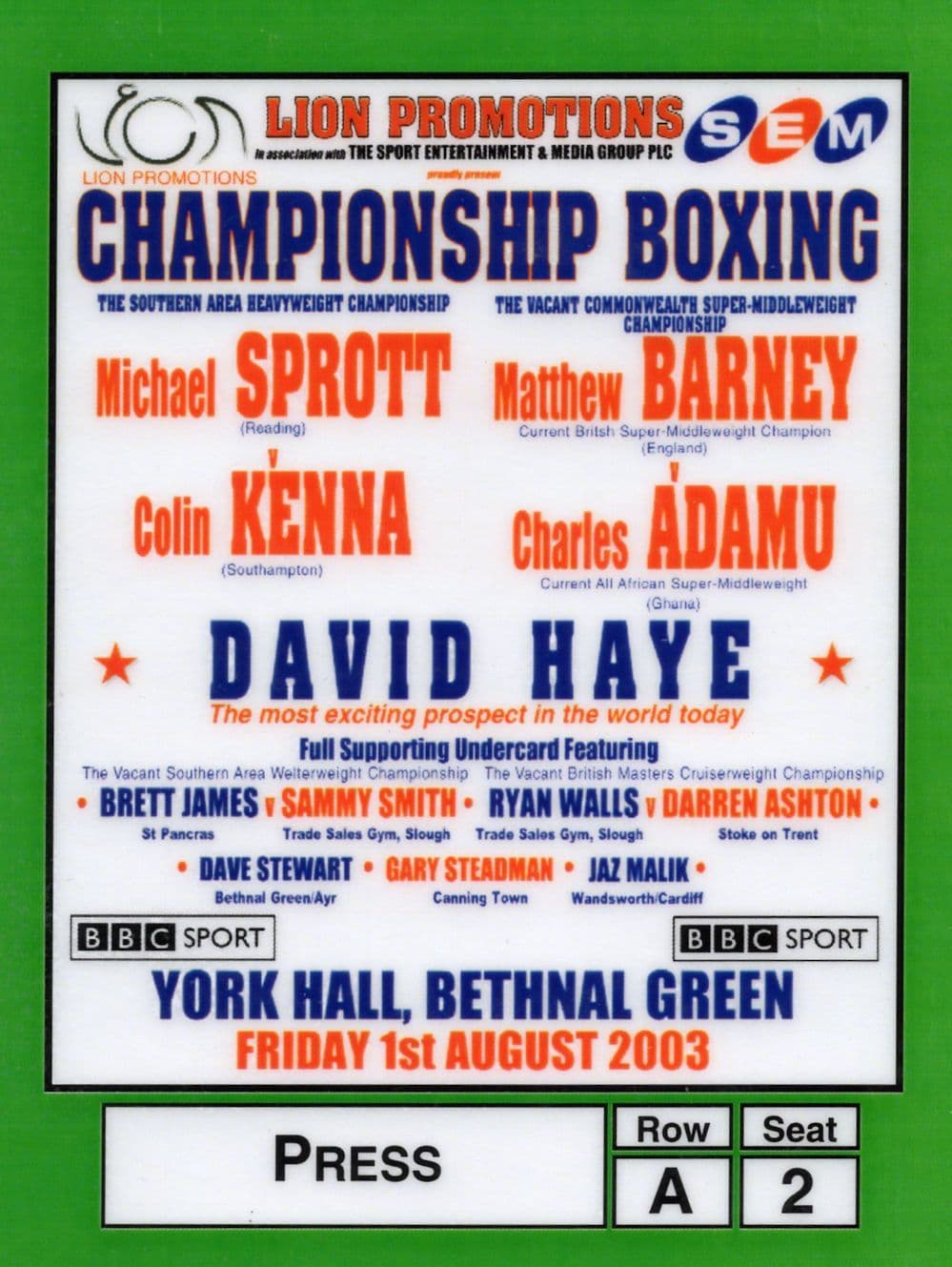 BG210  A vintage 2003 press pass for David Haye at Bethnal Green when he was barely heard of and the pass says "The most exciting prospect on the world today" who fought alongside Michael Sprott, Colin Kenna etc (please enlarge) in an epic evening - This is for Row A Seat 2 and private Press Pass for the newspaper photographer for the evening won at a specialist auction sale and is in mint condition in fully protected plastic too (as worn on the evening).