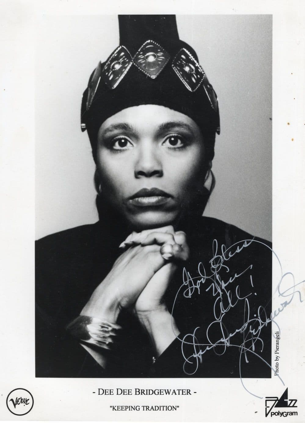 CHAU1856  A stunning large 9" x 6" official Polygram hand signed photo for Jazz singer Dee Dee Bridgewater who has personally autographed the souvenir in metallic silver pen where her signature rests perfectly accompanying her portrait in mint condition and undedicated too.