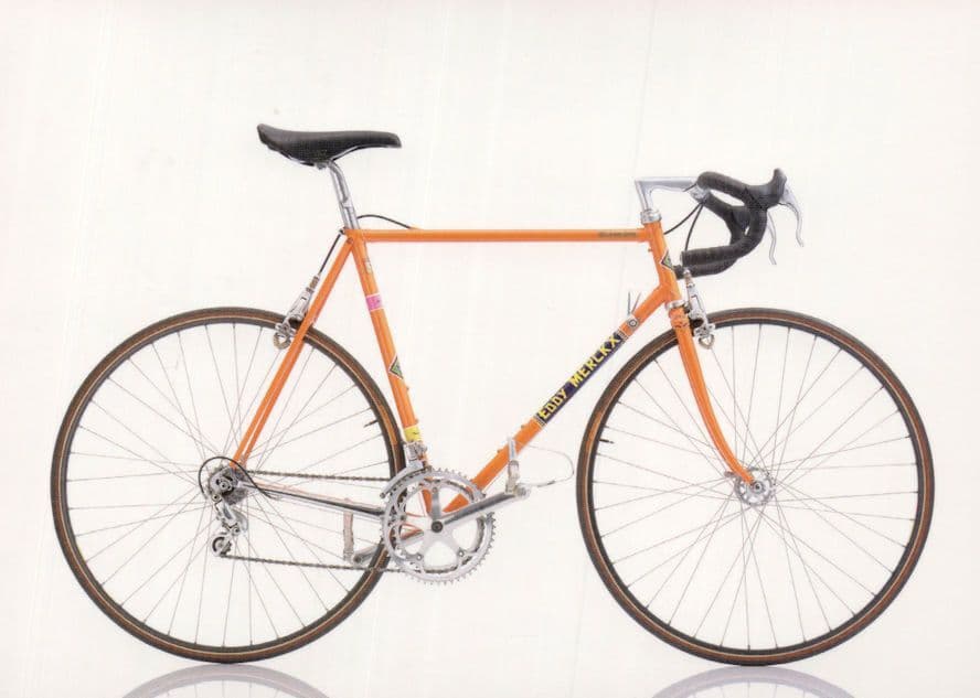 CY3  This unique and most specialist postcard is modern origin & is a concise souvenir of the Eddy Merckx Corsa Extra 1990 Belgium built bicycle with artist impression on the front, and in message area includes full details of its date of production, weight, frame, gears, brakes and more being a must for any bicycle collector unused and in absolute mint condition.