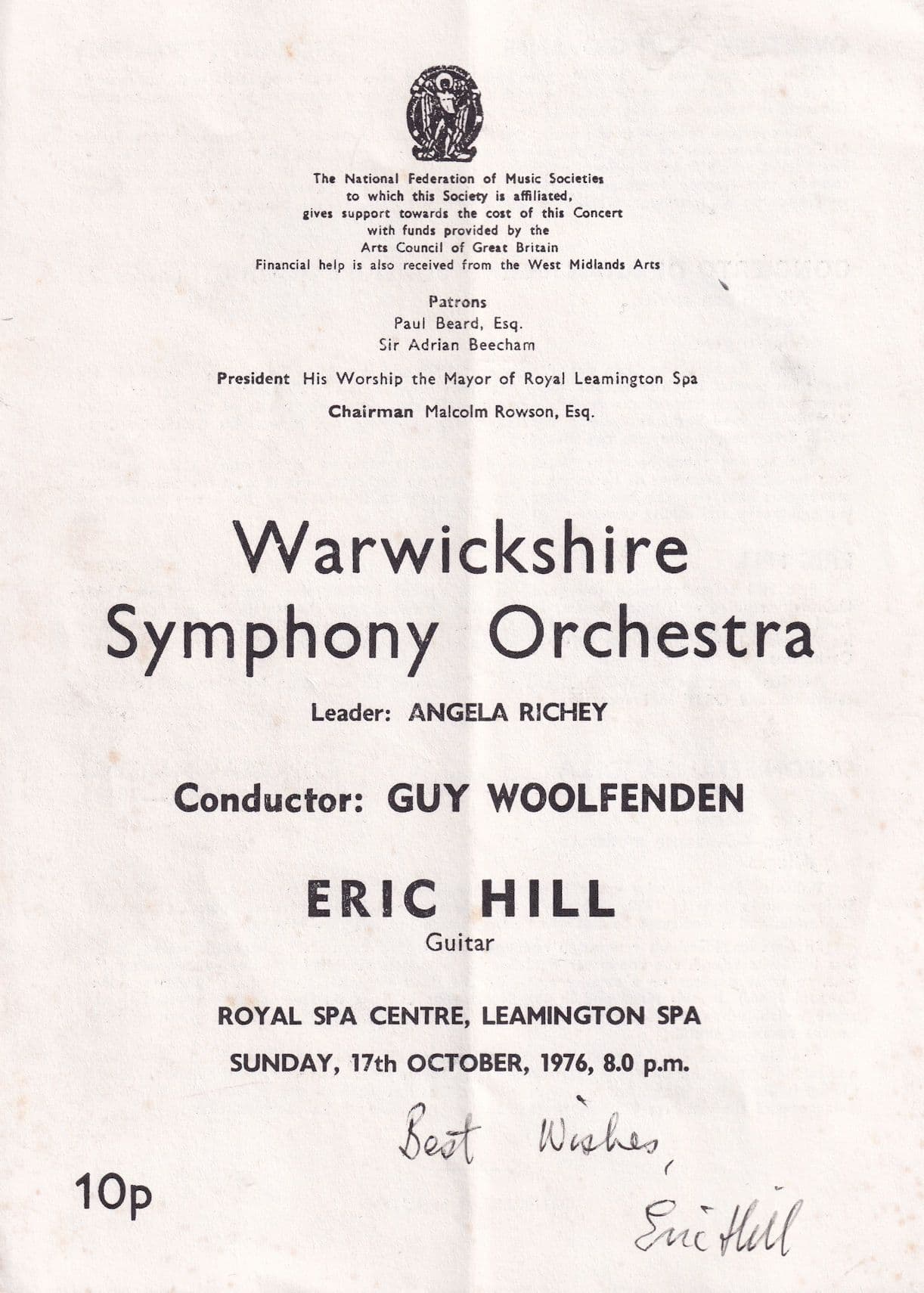 chau3378  A vintage programme from the Warwickshire Symphony Orchestra in 1976 with Eric Hall starring on classical guitar who has personally signed the souvenir on the front cover undedicated and this is nostly great condition.  It comes with two newspaper cuttings of the show too so a nice small bundle of ephemera.