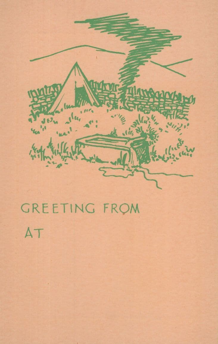 zx507 A vintage postcard that whilst came from a predominantly 1950s collection this looks much earlier - It is specially for Scouts and Guides and sends the user Greetings From The Camp which the user can complete when posting - It was published by Newington Causeway London company and the card is mostly green too adding to the Scouting colours - Reverse (not shown) has the address area to complete by the Scout for the recipient, and shows a further artist image of three scouts walking together - It is unused and mint and has great character. (is this a bath built in the lower right corner of the postcard?).