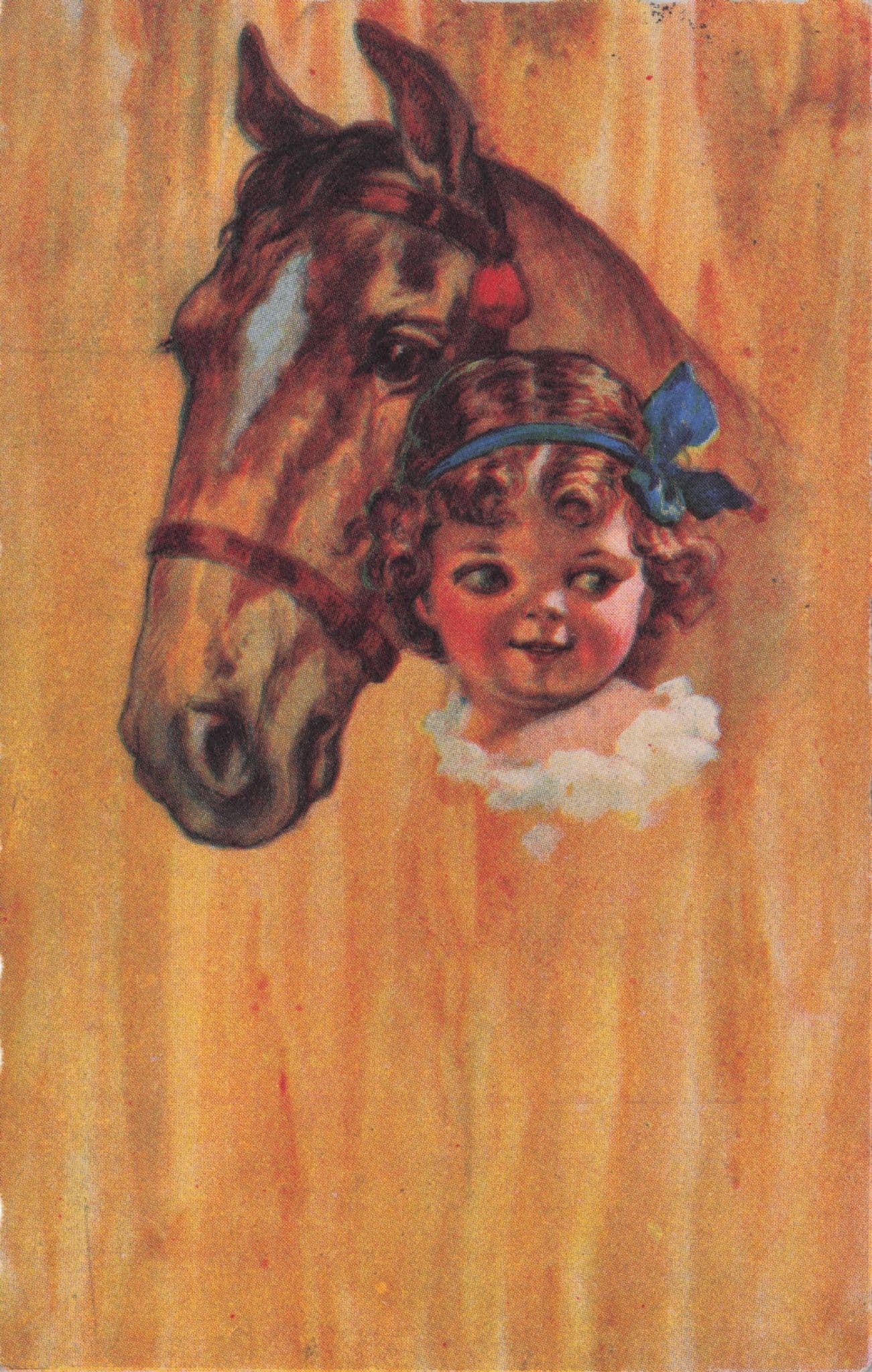 NP165  Antique rare 1920s postcard of this girl with her race horse rich with yellow colour so oilette style used but excellent condition