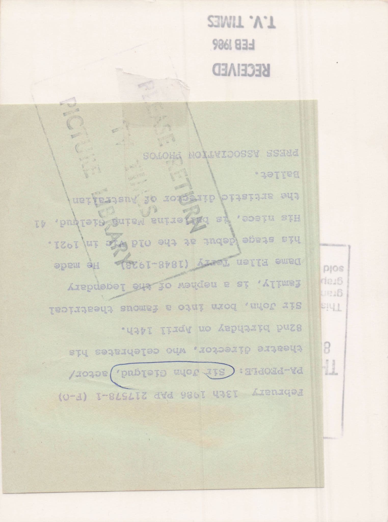 CHAU4459 ORIGINAL 8" x 6" VINTAGE PRESS PHOTO FROM THE TV TIMES ARCHIVES - This listing forms part of a collection of early television media photos for historic actor John Gielgud and from one of the most specialist collections of its kind. This features John about to celebrate his 82nd birthday. It has the TV Times official press markings & hallmarks on reverse (see image 2) . Has slight imperfections otherwise pristine. It was the official TV Times master for using that week in the ITV magazine. Own a piece of John Gielgud history and please see all my other John Gielgud vintage press photos at my store.