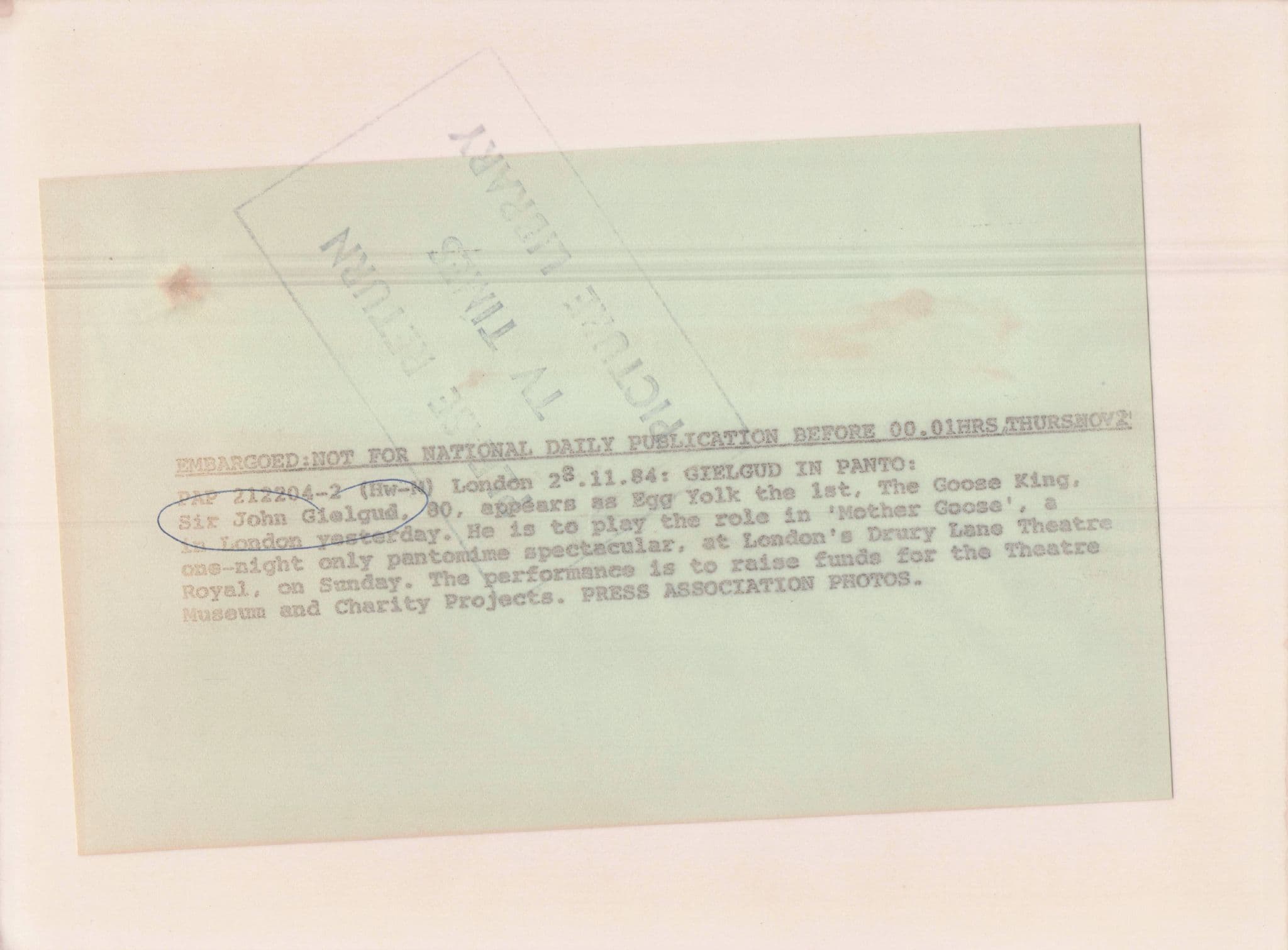 CHAU4458 ORIGINAL 9" x 7" VINTAGE PRESS PHOTO FROM THE TV TIMES ARCHIVES - This listing forms part of a collection of early television media photos for historic actor John Gielgud and from one of the most specialist collections of its kind. This features John Gielgud starring as The Goose King pantomime in November 1984. It has the TV Times official press markings & hallmarks on reverse and all the details of the show (see image 2) .It is outstanding condition. It was the official TV Times & London press master for using that week in the publications. Own a piece of John Gielgud history and please see all my other John Gielgud vintage press photos at my store.