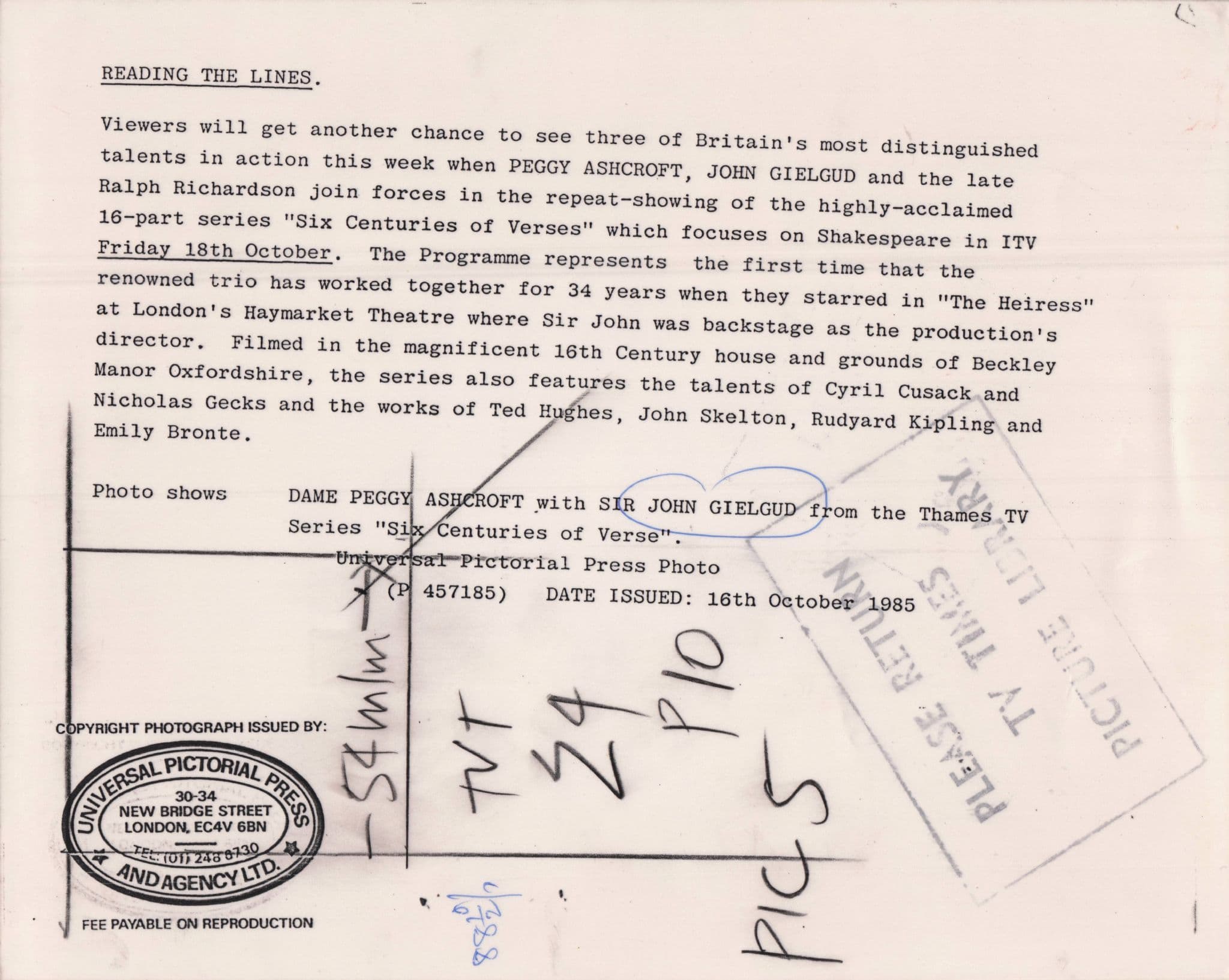 SMATZBD ORIGINAL 9" x 7" VINTAGE PRESS PHOTO FROM THE TV TIMES ARCHIVES - This listing forms part of a collection of early television media photos for historic actor John Gielgud and from one of the most specialist collections of its kind. This features John with Peggy Ashcroft in 1985 filming the six part series for television Six Centuries Of Verse. It has the TV Times official press markings & hallmarks on reverse (see image 2) . Bar small places it is mostly excellent condition.. It was the official TV Times master for using that week in the ITV magazine. Own a piece of John Gielgud history and please see all my other John Gielgud vintage press photos at my store.