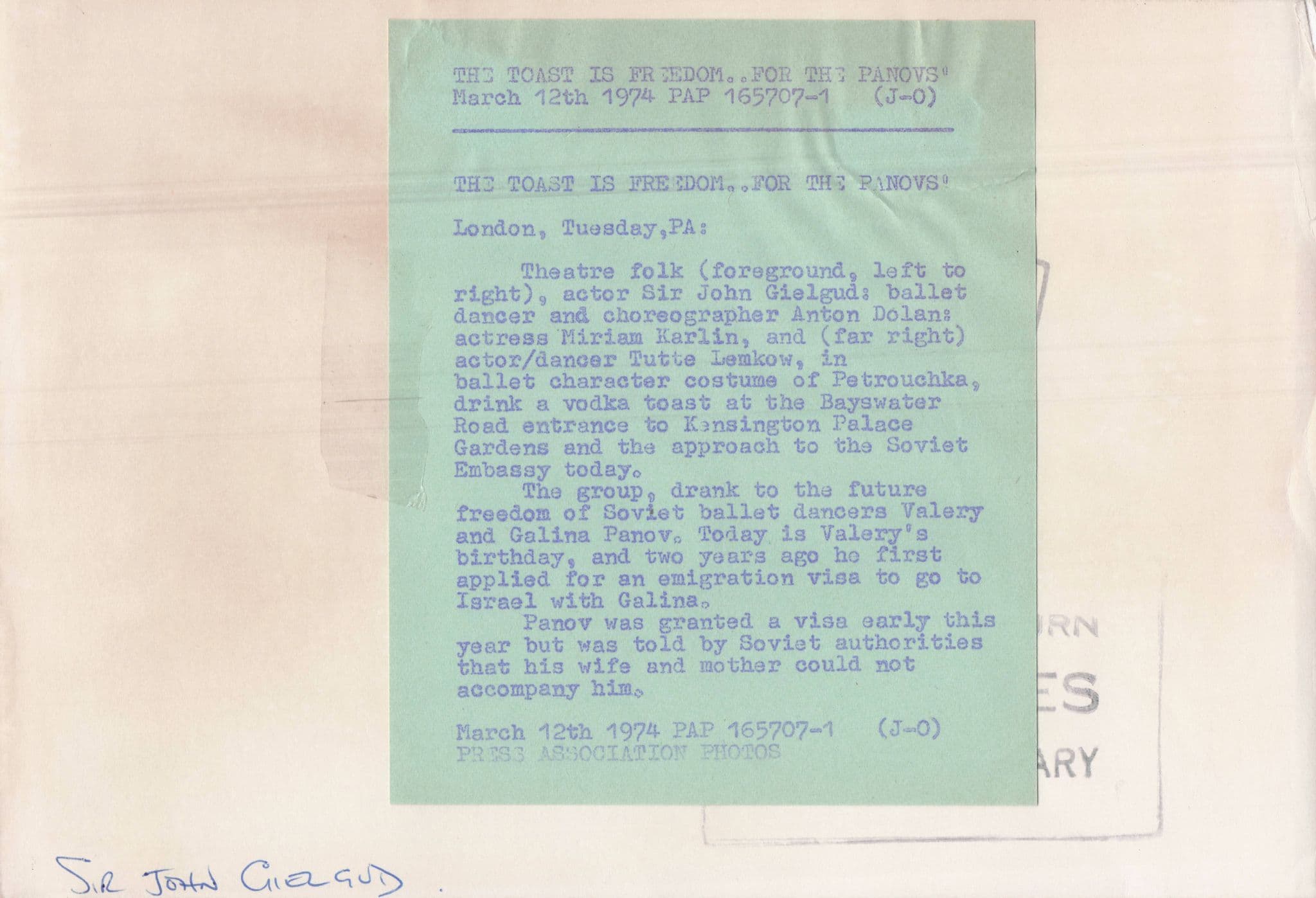 SMATZBD ORIGINAL 9" x 7" VINTAGE PRESS PHOTO FROM THE TV TIMES ARCHIVES - This listing forms part of a collection of early television media photos for historic actor John Gielgud and from one of the most specialist collections of its kind. This features John at Kensington Hall in 1974 toasting the Soviet Ballet Dancers for the future of their freedom. It has the TV Times official press markings & hallmarks on reverse (see image 2) . It is graded vg+ (small places and some lines on surface otherwise excellent). It was the official TV Times master for using that week in the ITV magazine. Own a piece of John Gielgud history and please see all my other John Gielgud vintage press photos at my store.