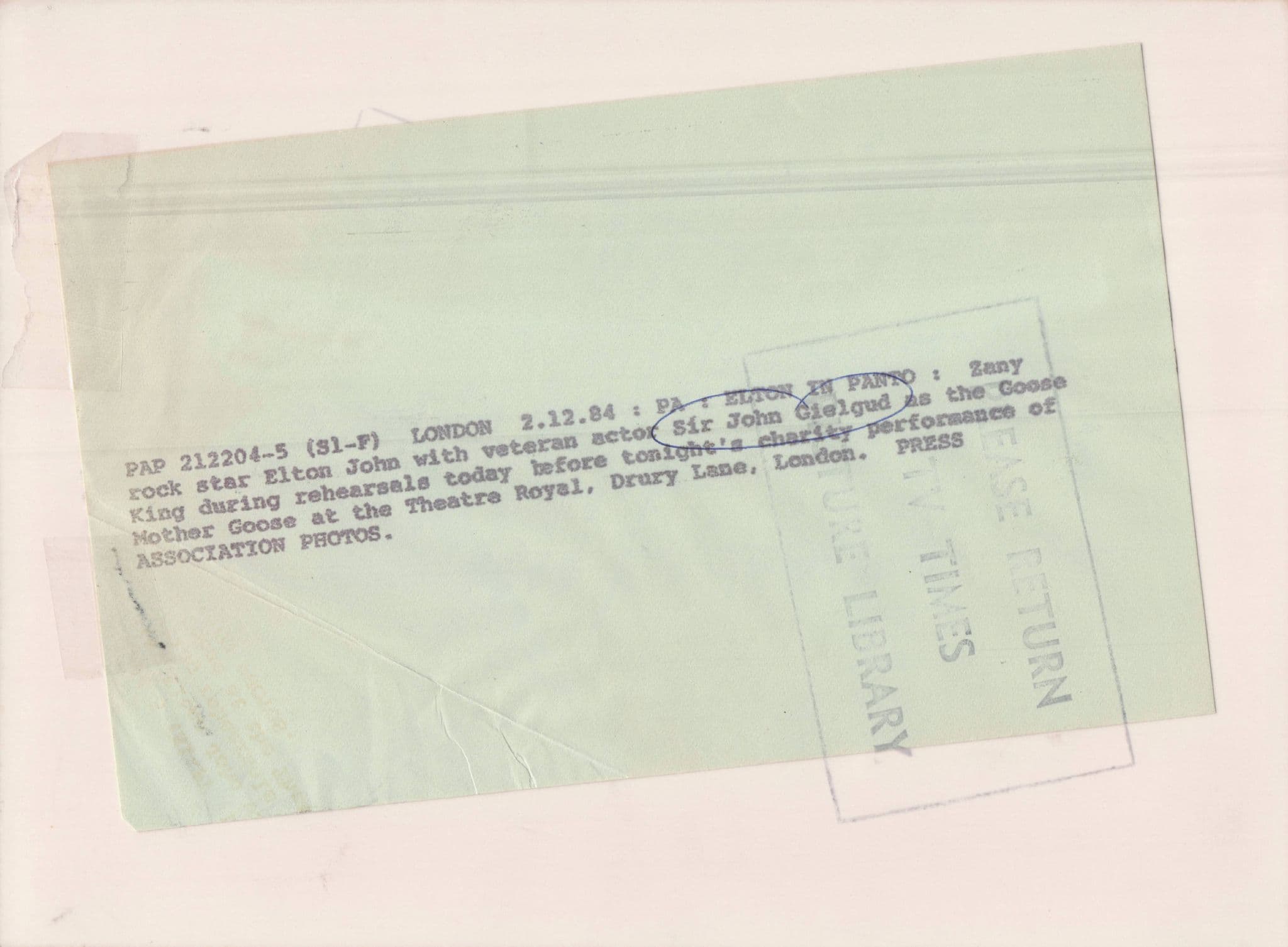 CHAU4458 ORIGINAL 9" x 7" VINTAGE PRESS PHOTO FROM THE TV TIMES ARCHIVES - This listing forms part of a collection of early television media photos for historic actor John Gielgud and from one of the most specialist collections of its kind. This features John Gielgud with Sir Elton John in 1984 rehearsing for The Goose King. It has the TV Times official press markings & hallmarks on reverse (see image 2) . It is very good condition (bar light surface and mild press places just to notes on reverse it is great condition). It was the official TV Times master for using that week in the ITV magazine. Own a piece of John Gielgud history and please see all my other John Gielgud vintage press photos at my store.
