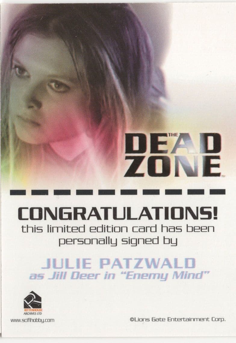 TC12 Surely the best opportunity of its kind to secure this rare personal signing of Julie Patzwald as Jill Deer in The Dead Zone and of which her hand signature is placed perfectly below her portrait. This is the official Dead Zone TV show souvenir and this signing has been fully validated on the reverse for the ultimate in lifetime authentification. It reads on the other side "Congratulations..This limited edition card has been personally signed by Julie Patzwald as Jill Deer" - It is in absolute mint condition. Same day UK dispatch