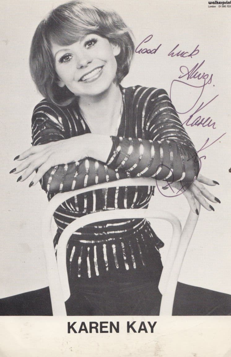 pfas168 This is a stunning 6" x 4" hand signed photo of jazz singer and former Three Of A Kind TV show presenter Karen Kay which this signing dates to the 1970s - has maybe light but very evident corner handling marks to lower corners so please be fully aware - mild surface etc mostly very good overall vg minus - the signing rests perfectly besides her portrait reading Good Luck Always Karen Kay and is undedicated too