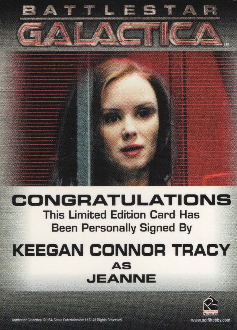 TC3 Surely the best opportunity of its kind to secure this very rare personal signing of Keegan Connor Tracy as Jeanne in the cult sci-fi show Battlestar Galactica where her signature is placed perfectly below her portrait. This is the official TV show souvenir and the signing has been fully validated on the reverse for the ultimate in lifetime authentification. It reads on the other side "Congratulations... This limited edition card has been personally signed by Keegan Connor Tracy as Jeanne " ... . It is in absolute mint condition.