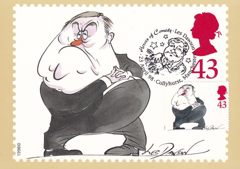 BG237  A stunning postcard from around 20 years ago and official Royal Mail card of Les Dawson they used as the design for a postal stamp with details of its creation etc on reverse.  This particular postcard is of great interest to any Manchester historian as it covers the Collyhurst Manchester local postmark on the front of the card from its first day of release not found in others unused and mint.