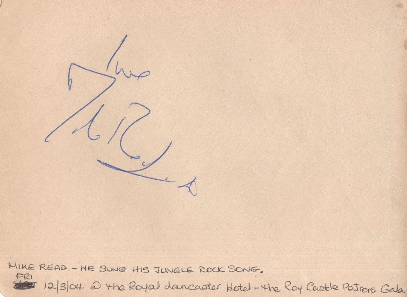 CHAU2069  A vintage appearance but dated 12th March 2004 autograph page from Eastenders star Mike Reid with the fans notes by the autograph state.. "Mike Redid after he sang his Jungle Rock Song - 12th March 2004 at The Royal Doncaster Hotel - The Roy Castle Patrons Gala" - Mostly great condition.
