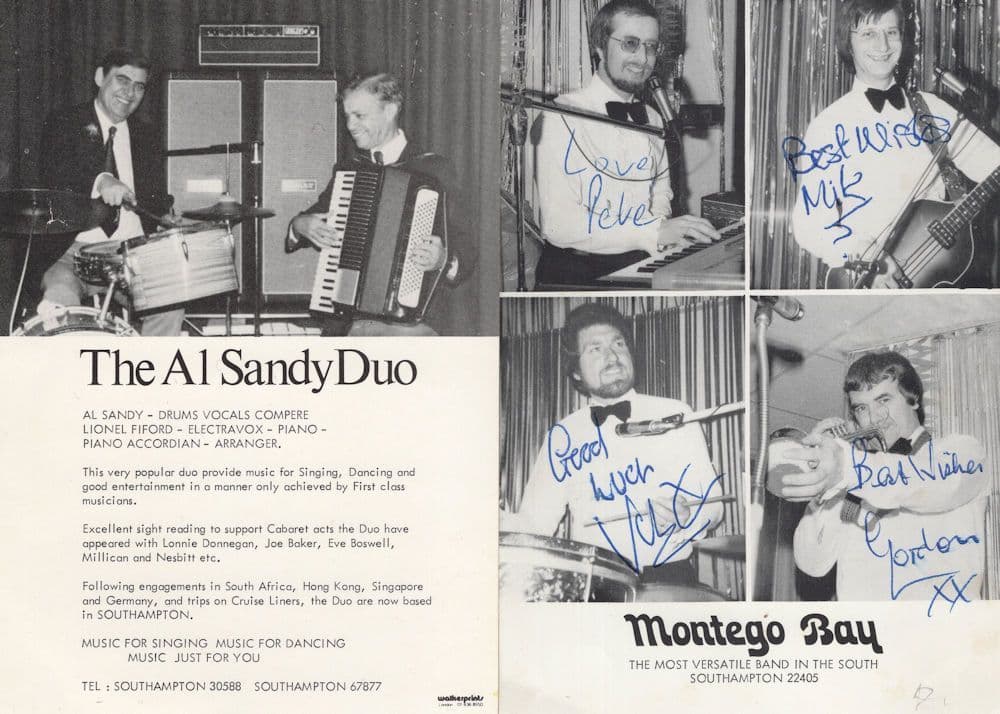 PFAS35 A vintage hand signed 6" x 4" signed official photo for Montego Bay who were a vintage jazz band from Southampton (please enlarge and view) who described themselves as the most versatile band in the world all who has personally autographed the souvenir where each members signature rests perfectly accompanying his portrait bar small place in outstanding condition. Comes with second souvenir of Southampton duo of The Al Sandy Duo from aroud the same late 1970s era again hand signed but this time the signatures are on the reverse - this has a fault to left edge and light places otherwise great overall graded vg minus - two great fully autographed Southampton vintage souvenirs of local music stars.