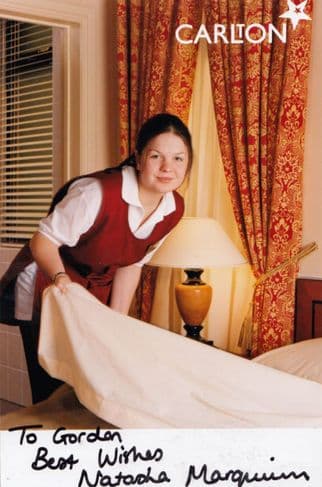 cel111 Original 6" x 4" official central television Crossroads 2001 remake cast card for Natasha Marquiss as Mandy Stokes who has personally signed the photo where her signature rests perfectly accompanying the portrait in mint condition showing her preparing the hotel room for the guests arrival at the Crossroads hotel (undedicated too)