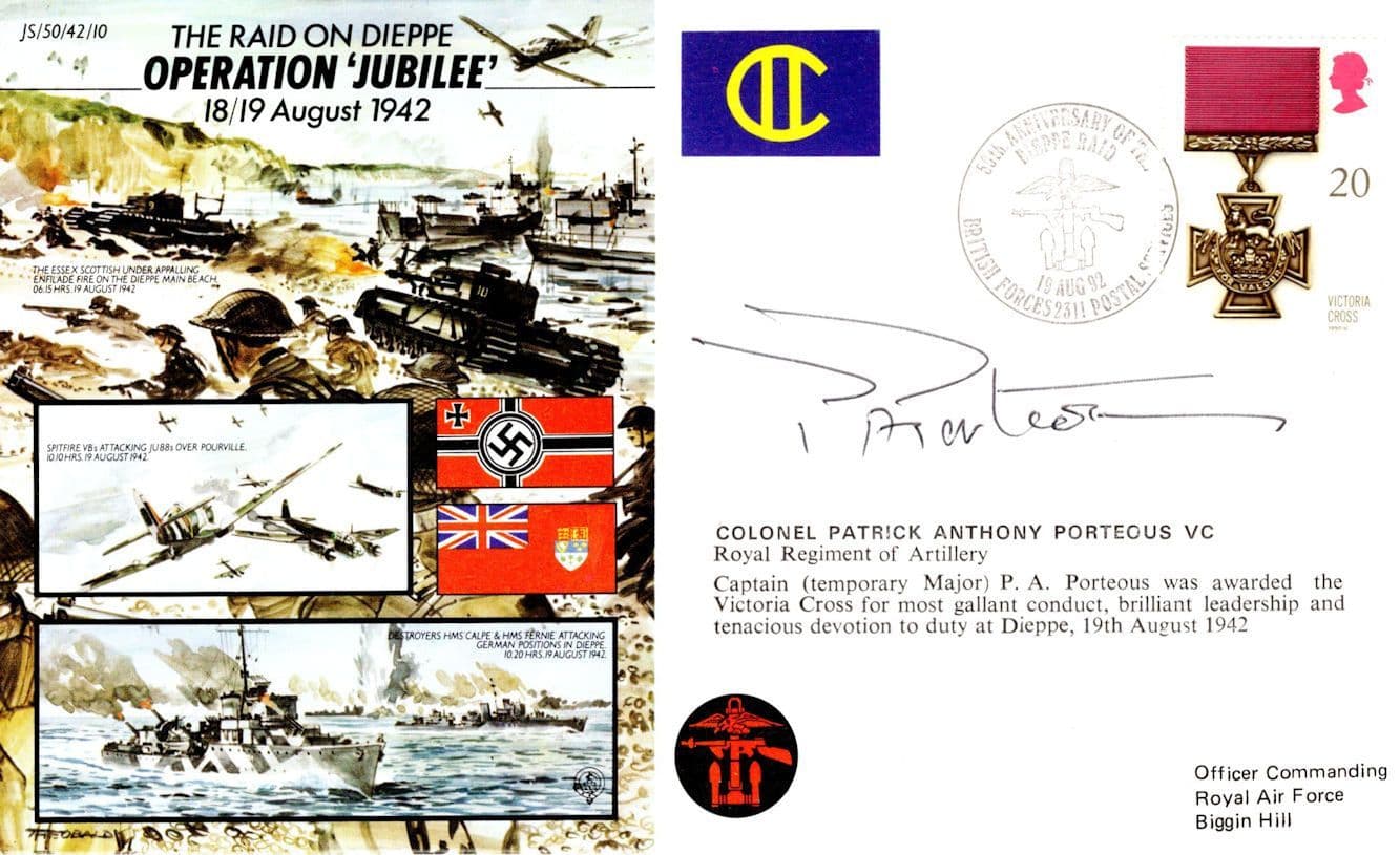 STB031 This is stunning collectors official limited Operation Jubilee first day cover hand signed by Colonel Patrick Porteous where the signature rests perfectly accompanying the special hand commemorative franks. This comes with full lifetime COA as the signing has been officially certified by the publishers with full hallmarking and authenticity of the series further detailed in absolute brand new mint condition. You wont source better.