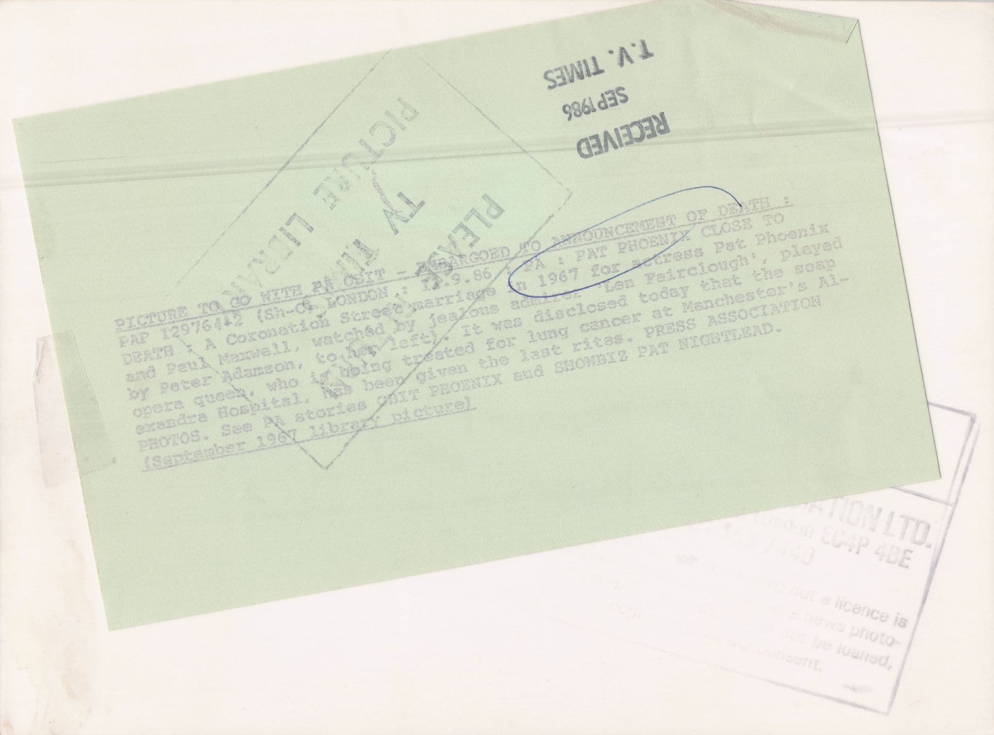 CHAU4368 ORIGINAL 8" x 6" VINTAGE PRESS PHOTO FROM THE TV TIMES ARCHIVES - This listing forms part of a collection of early television media photos for historic Coronation Street actress Pat Phoenix and from one of the most specialist collections of its kind. This features her wedding day from the show with Len Fairclough however this is a tragic souvenir as it was used to announce of her being close to death from lung cancer and sharing one of her most treasured screen moments. It has the TV Times official press markings & hallmarks on reverse (see image 2) . It has a region to upper left corner which must be allowed otherwise excellent so graded vg. It was the official TV Times master for using that week in the ITV magazine. Own a piece of Coronation Street history and please see all my other Pat Phoenix TV press photos at my store.