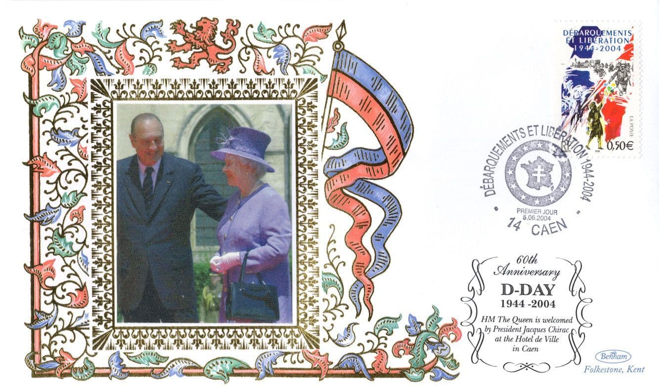 STB25  A stunning rare Benham's limited edition D-Day 60th Anniversary Queen Elizabeth II first day cover showing her former Majesty in the celebrations of the day with beautiful upmarket raised surround and metallic borders for the colours of the flag which seems very scarce and is in mint as new condition. You wont source better.