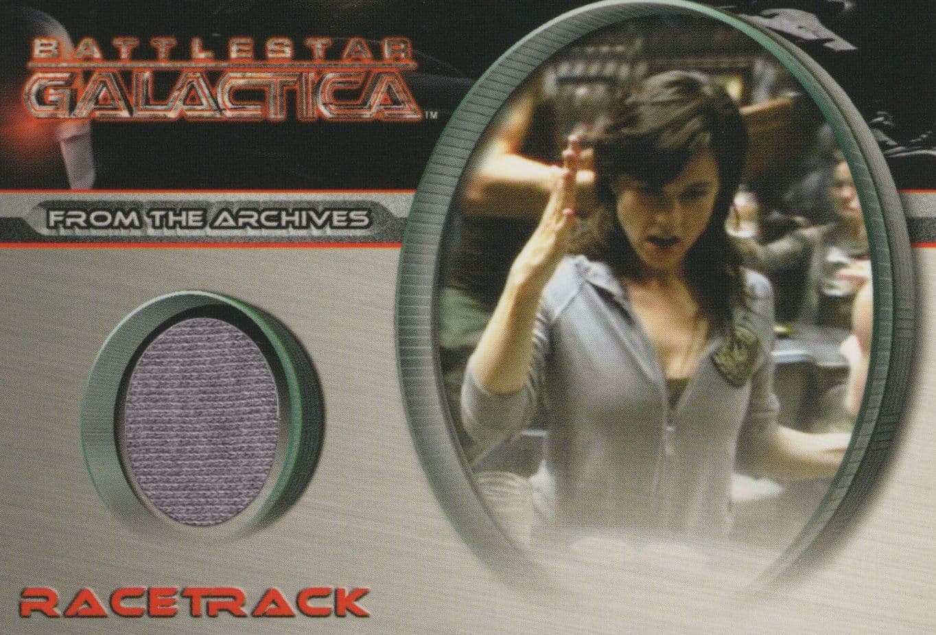 TC3 Here is a fantastic opportunity to win a piece of the costume worn by Racetrack in the cult sci-fi show Battlestar Galactica. The souvenir contains the cloth within special protective sealing and on reverse it shows the photo with Racetrack wearing the clothing in the episode which is now within the card that she wore that day when filmed. It has full details on the card and officially authenticated for the ultimate in lifetime guarantee and is in absolute mint condition. You wont source this better anywhere.