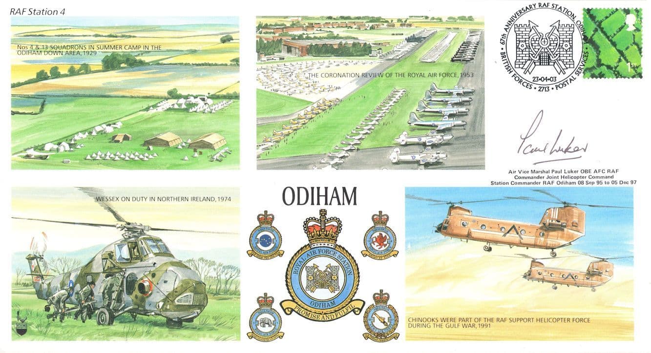 STB021 This is stunning RAF Odiham collectors official limited first day cover hand signed by Air Vice Marshall Paul Luker OBE where the signature rests perfectly accompanying the special hand commemorative franks. This comes with full lifetime COA as the signing has been officially certified by the publishers with full hallmarking and authenticity of the series further detailed in absolute brand new mint condition with additional signature on reverse to fully authenticate and a large map of Odiham nwhich this edition is LIMITED TO ONLY 100 and numbered 100 from the series (see image 2). You wont source better.