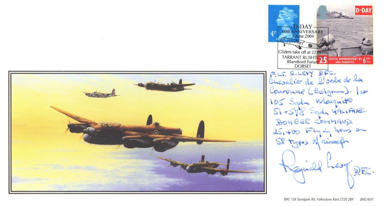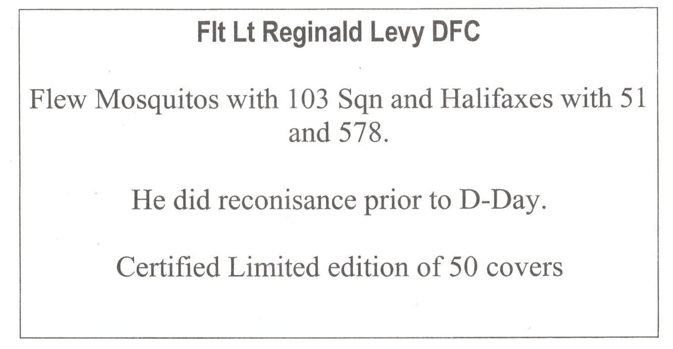 STB018 This is stunning British Heritage collectors official limited Bombers first day cover hand signed by historic D-Day pilot Reginald Levy (DFC) where the signature rests perfectly accompanying the special hand commemorative franks. Regd Levy flwer Mosquitoes with 103 Squadron and Halifaxers with 51 and 578 and did reconisance prior to D-Day. This comes with full lifetime COA as the signing has been officially certified by the publishers with full hallmarking and authenticity of the series further detailed in absolute brand new mint condition (please see image 2). It was a limited edition of only 50 and it is hand numbered 26 of the 50 series. You wont source better. Has long hand written message from Reginald Levy to accompany his signing of his historic role in WW2.