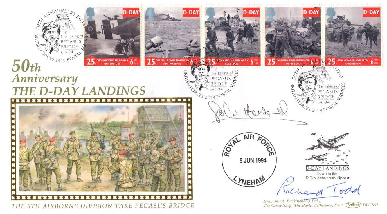 STB014 This is a vintage appearance but 20 years ago FDC for 1944 Uncle Sam military souvenir hand signed by Richard Todd and Jim Wallwork where the signatures rest perfectly accompanying the 1944 souvenir postmark bar light places this is truly outstanding condition.