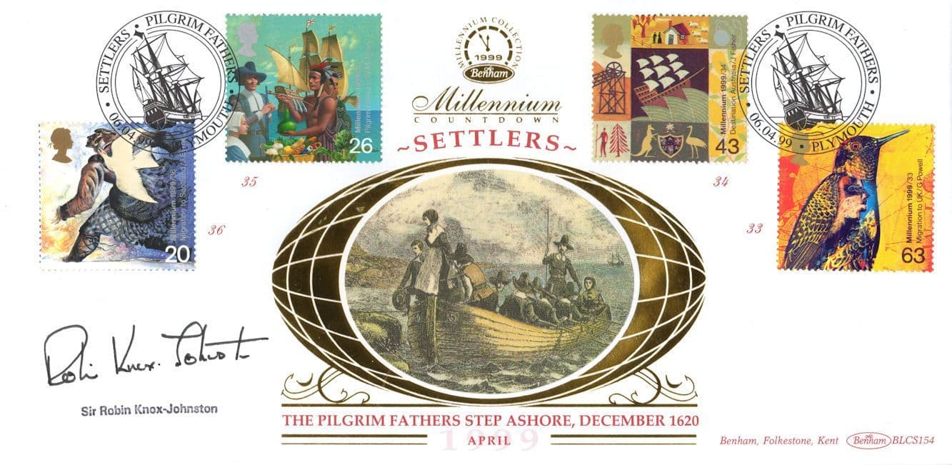 STB013 This is stunning Benhams collectors official limited Settlers Pilgrim Fathers first day cover hand signed by Robin Knox Johnston where the signature rests perfectly accompanying the special hand commemorative franks. This comes with full lifetime COA as the signing has been officially certified by the publishers with full hallmarking and authenticity of the series further detailed in absolute brand new mint condition. You wont source better.