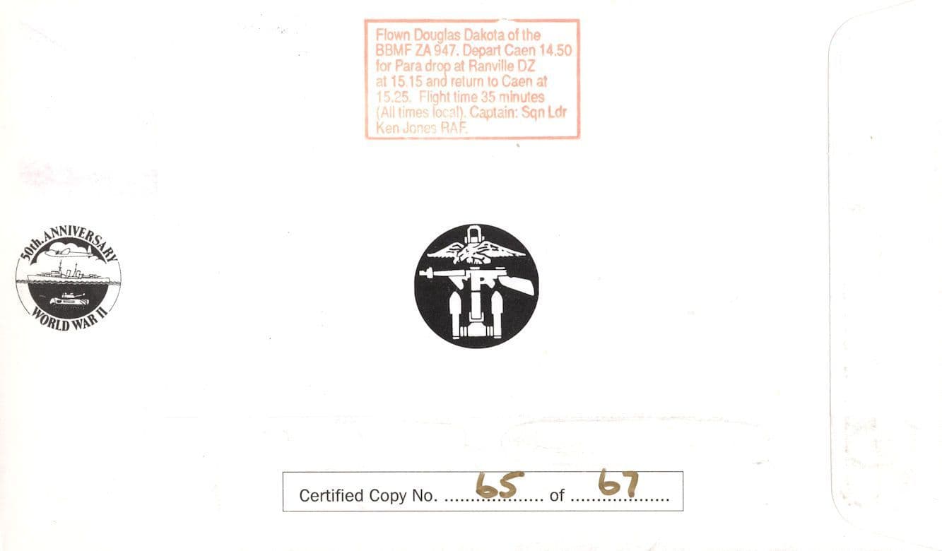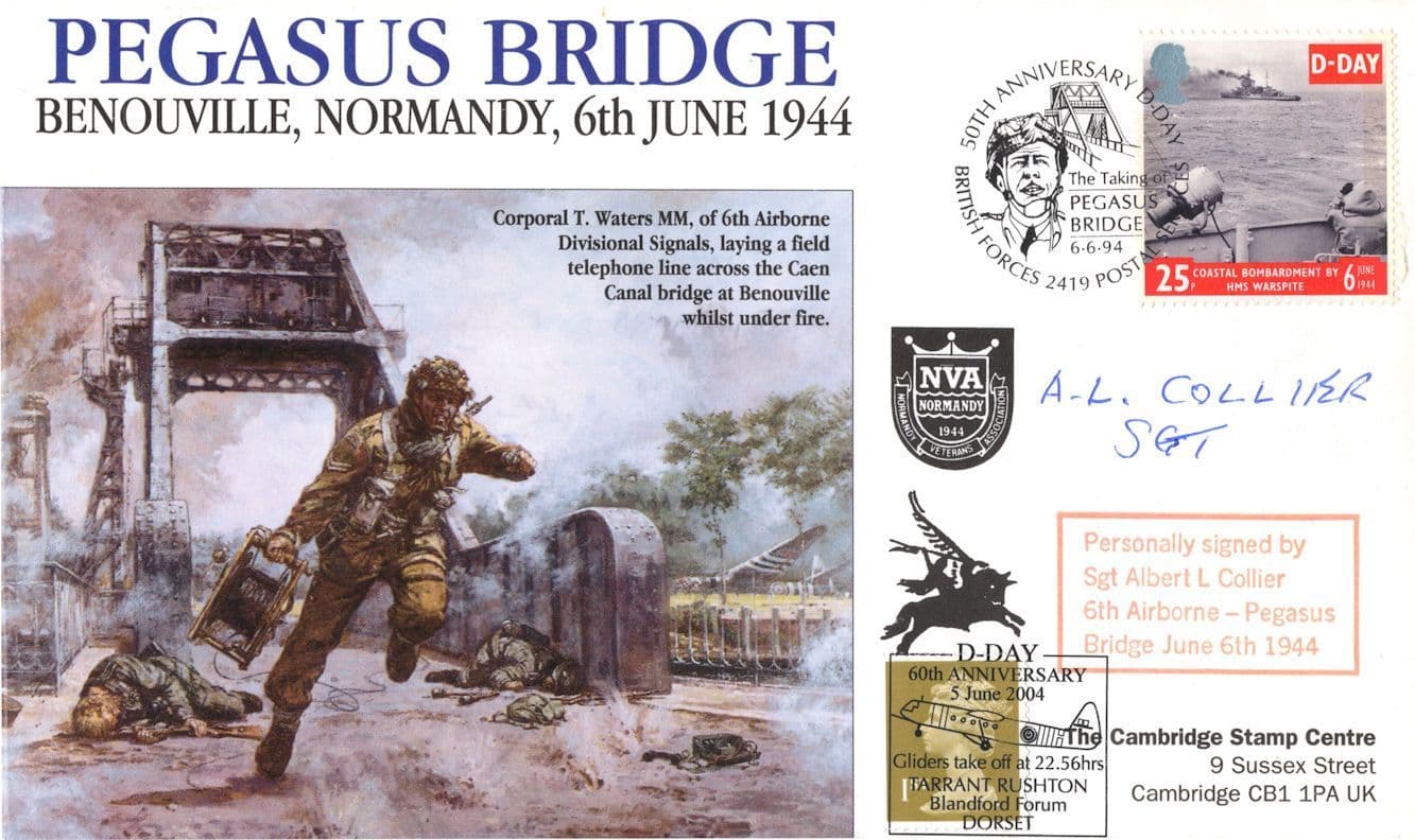 STB014 This is rare official hand signed first day cover celebrating the 50th Anniversary of D-Day and Pegasus Bridge and hand signed by Pegasus Bridge hero Sergeant Albert Collier and which has been fully certified by the publishers (see scan including the large frank of how it is personally autographed by Wally Parr) and is in mint condition. It was a limited edition of only 67 for world distribution and is hand numbered 65 from the series on reverse. You wont source better.